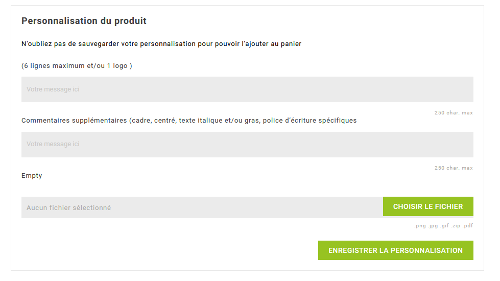 Bforis Posted May 19, 2021 Share Posted May 19, 2021 Salut ! J'ai un problème sur les pièces jointes dans les produits personnalisables (natif à prestashop 1.7). Les pièces jointes, une fois envoyé, disparaisse, ce qui fait que je ne reçois rien. Ca ne le fait pas sur tout les produits, je ne sais absolument pas pourquoi. Merci ! (Pièce jointe pour illustrer ce qui ne fonctionne pas une fois envoyé, aucune erreur javascript dans la console si ce n'est que ça n'arrive pas à retrouver une image). Link to comment Share on other sites More sharing options...