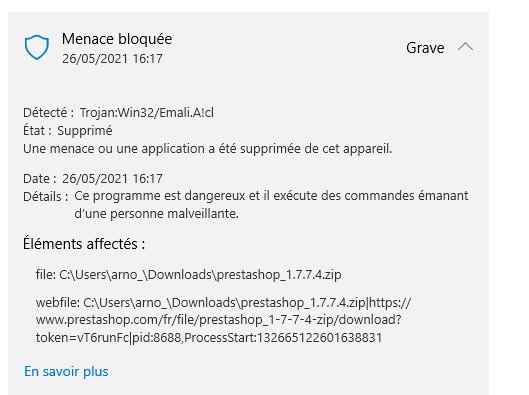 Arnaud86 Posted May 26, 2021 Share Posted May 26, 2021 Bonjour, Depuis dimanche, lorsque je veux télécharger Prestashop 1.7.7.4 à partir de prestashop.com (https://www.prestashop.com/fr/telecharger), WIndows met le téléchargement en échec en m'indiquant il a détecté un virus. Windows defender indique : Détecté Trojan:Win32/Emali.A!cl État : 26/05/2021 13:27 Détails :Ce programme est dangereux et il exécute des commandes émanant d’une personne malveillante. Éléments affectés : C:\Users\arno_\Downloads\prestashop_1.7.7.4.zip webfile: C:\Users\arno_\Downloads\prestashop_1.7.7.4.zip|https://www.prestashop.com/fr/file/prestashop_1-7-7-4-zip/download?token=vT6runFc|pid:232,ProcessStart:132665020502946783 Quelqu'un sait de quoi il s'agit et comment le résoudre ? Merci Link to comment Share on other sites More sharing options...