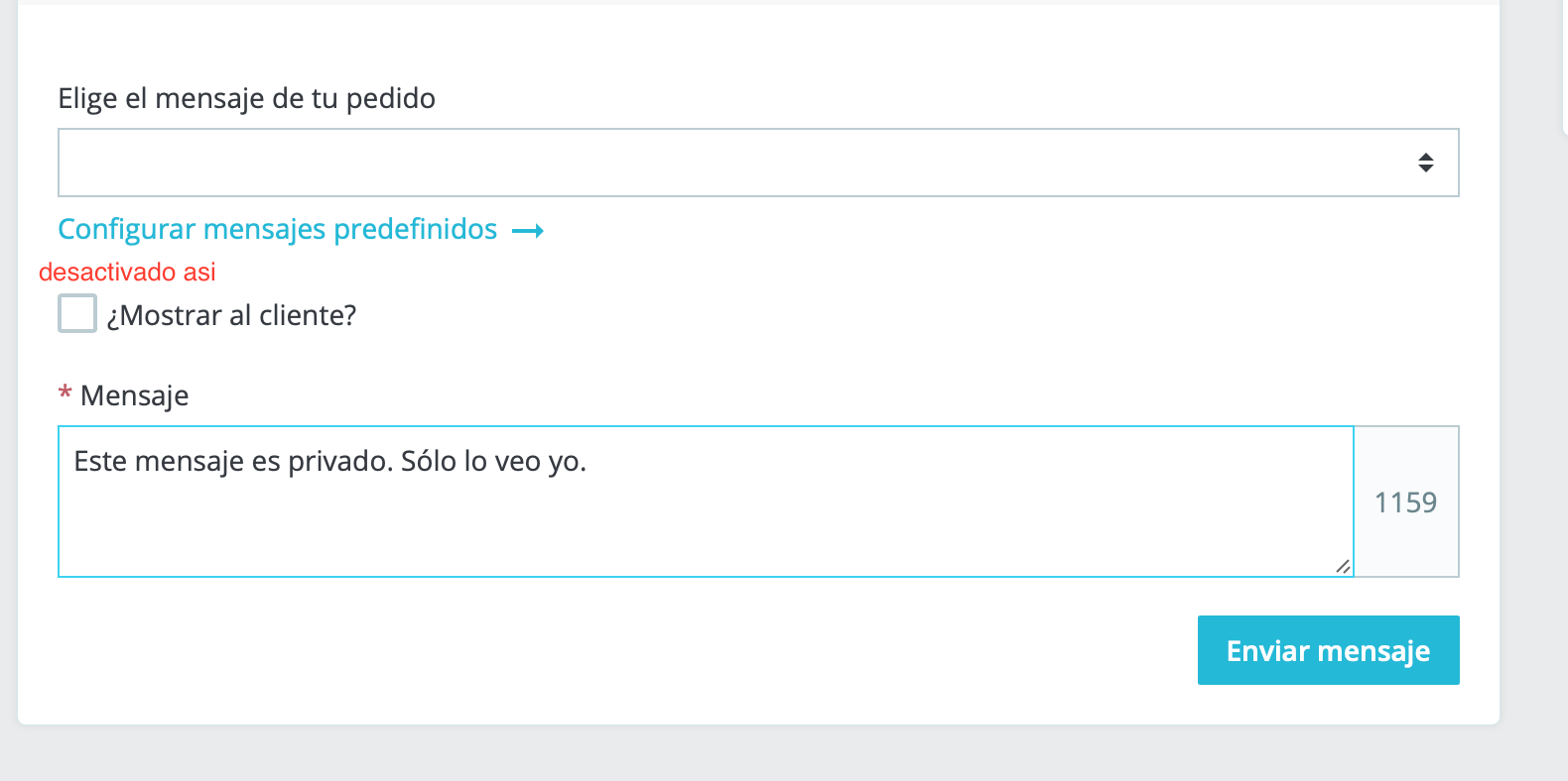El módulo tiene una opción para mostrar solamente los mensajes privados (los que escribes tú en el pedido y no marcas lo de "enviar al cliente", con lo cual el cliente no los ve) en el pdf, y no los del cliente.
