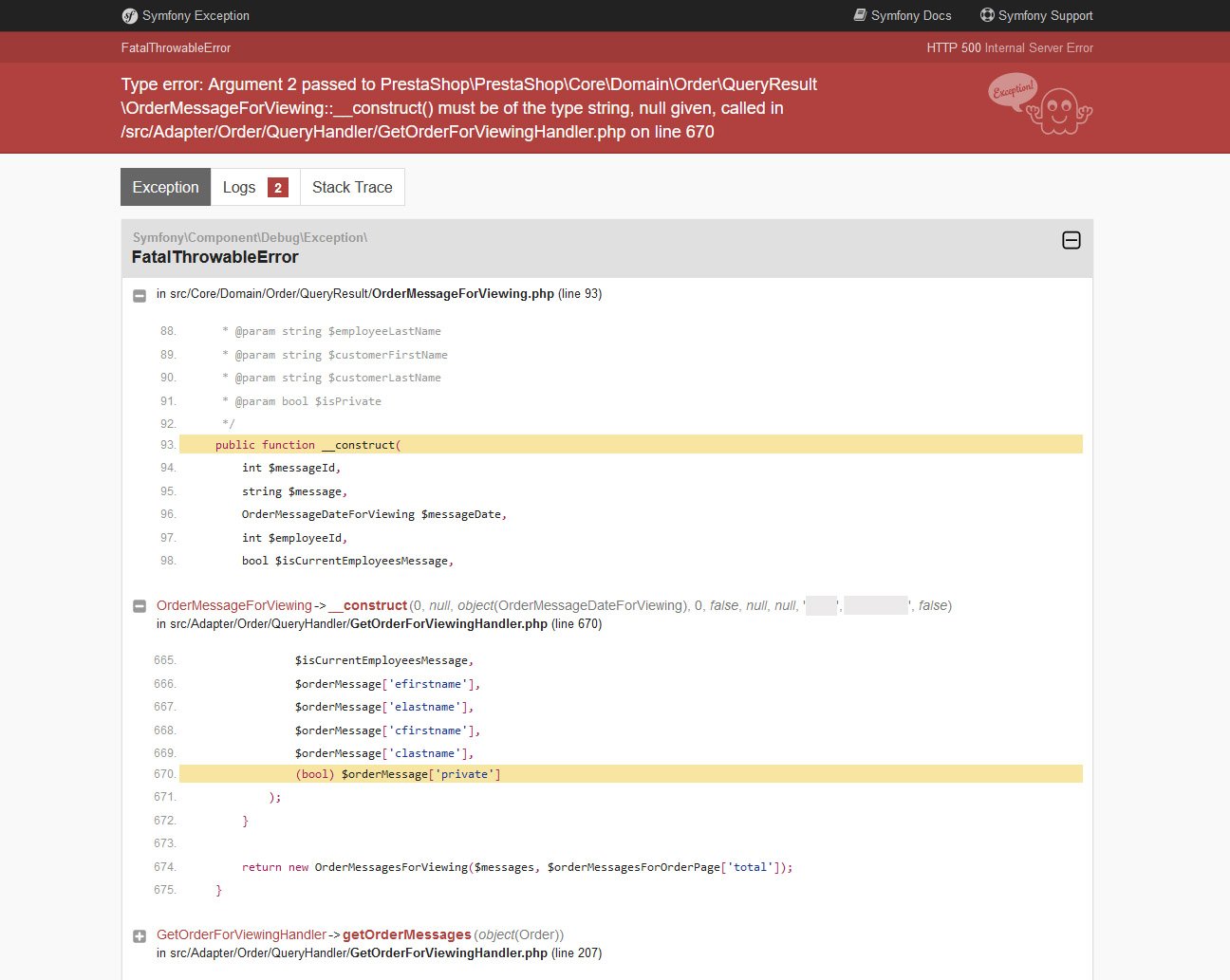 comete Posted June 10, 2021 Share Posted June 10, 2021 FatalThrowableError Type error: Argument 2 passed to PrestaShop\PrestaShop\Core\Domain\Order\QueryResult\OrderMessageForViewing::__construct() must be of the type string, null given, called in......./src/Adapter/Order/QueryHandler/GetOrderForViewingHandler.php on line 670 L'erreur n'est pas systématique, elle n'intervient que si le client a fourni un message lors du passage de la commande. Un message vide semble être créé ?controller=AdminCustomerThreads&id_customer_thread=0&viewcustomer_thread=1&token=d6c1702cf93a5bf33f7bce7f22e0e5c4 OrderMessageForViewing->__construct(0, null, object(OrderMessageDateForViewing), 0, false, null, null, 'xxx, 'XXX', false) in src/Adapter/Order/QueryHandler/GetOrderForViewingHandler.php (line 670) Le bug est reproduit à chaque commande où le client donne un message pour sa commande. Link to comment Share on other sites More sharing options...