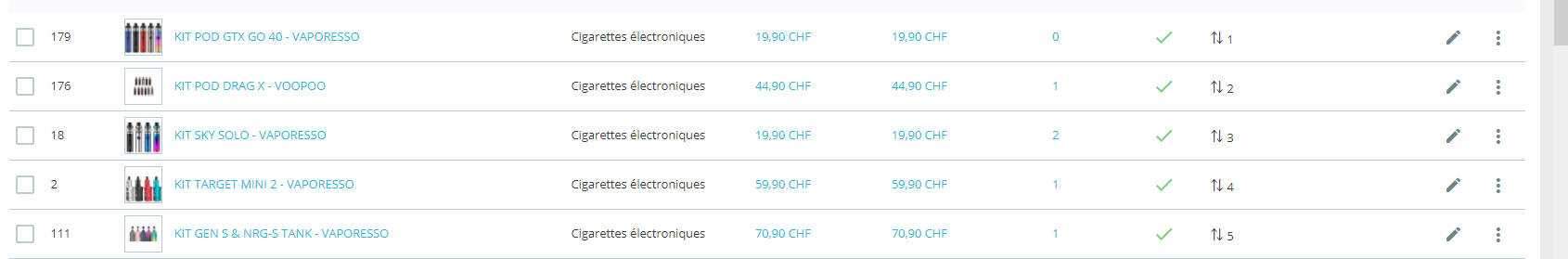 Set0x Posted June 15, 2021 Author Share Posted June 15, 2021 Bonjour, effectivement il y'a des sous catégories dans la catégorie Cigarettes électroniques. Je vais essayer de trier dedans également les positions. Je tente également de vidé le cache. Link to comment Share on other sites More sharing options...