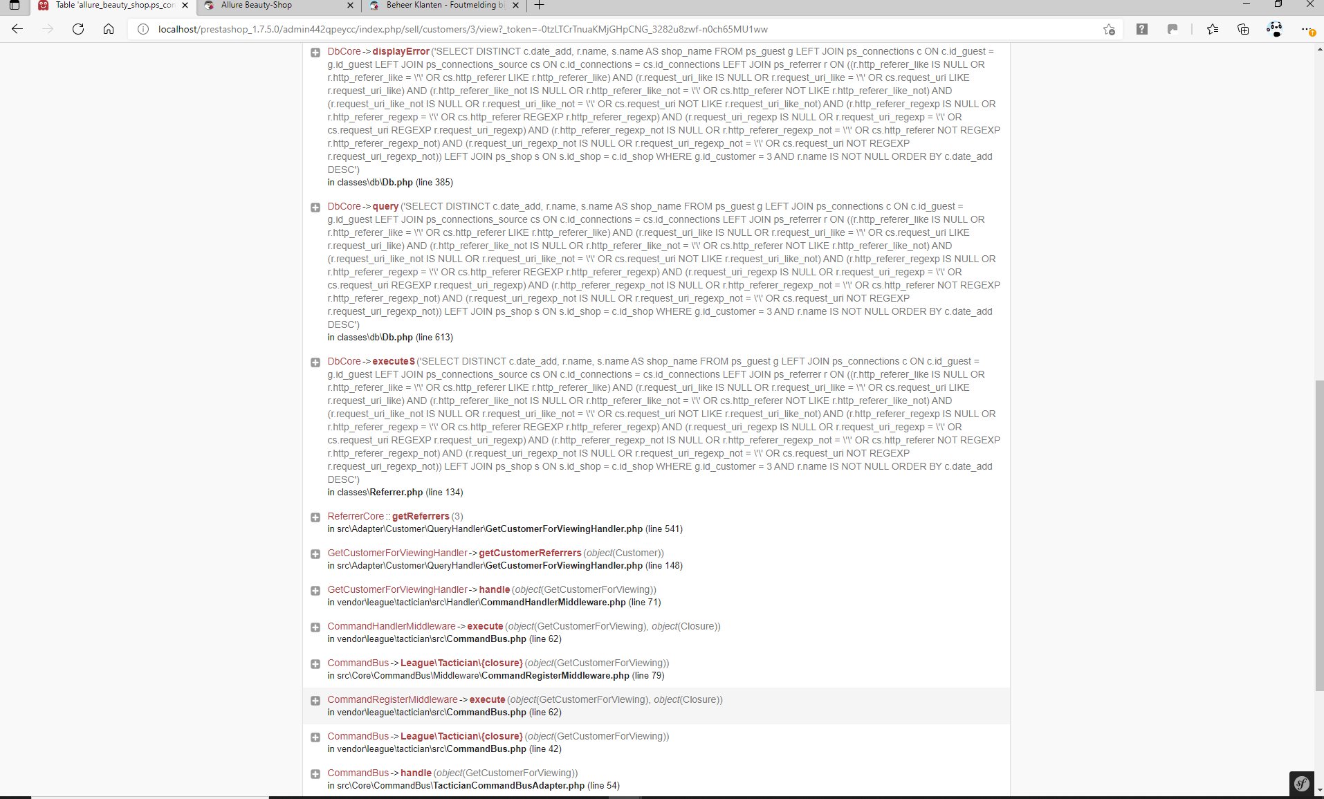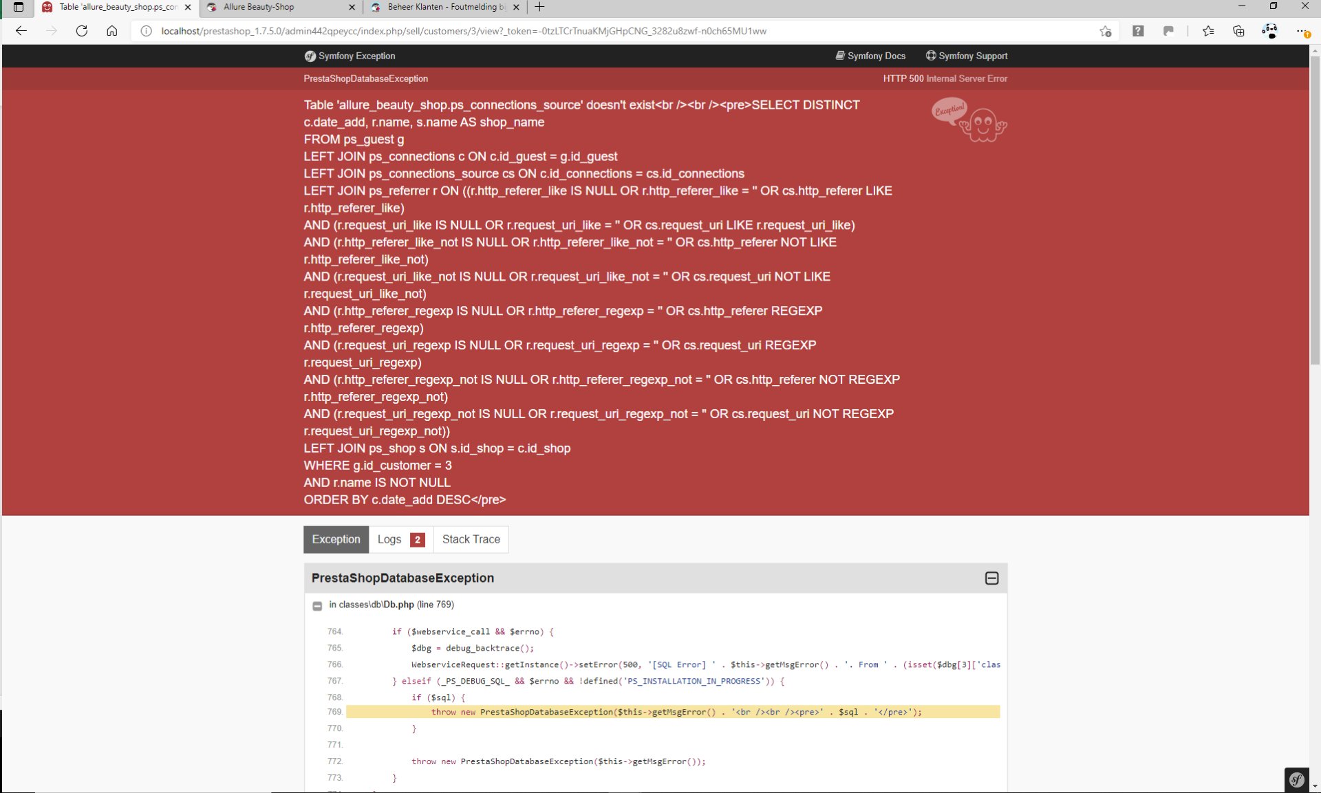 Rico_001 Posted June 26, 2021 Author Share Posted June 26, 2021 Goede Middag, Deze morgen heb ik besloten om de tabel ps_connections_source te verwijderen uit de database. Hierna heb ik de query gerund die u had voorgesteld (zonder de laatste lijn - die gaf een error). Hierna de cache leeggemaakt (var/cache/dev en var/cache/prod) alsook via geavanceerde instellingen - prestaties - cache legen) Nu kan ik opnieuw aanpassingen doen aan klanten / orders / winkelwagens. Het probleem is hierdoor weldegelijk opgelost. Nu kan ik mijn shop alvast online plaatsen en van daaruit verder werken. Met bijzondere dank Rico Link to comment Share on other sites More sharing options...