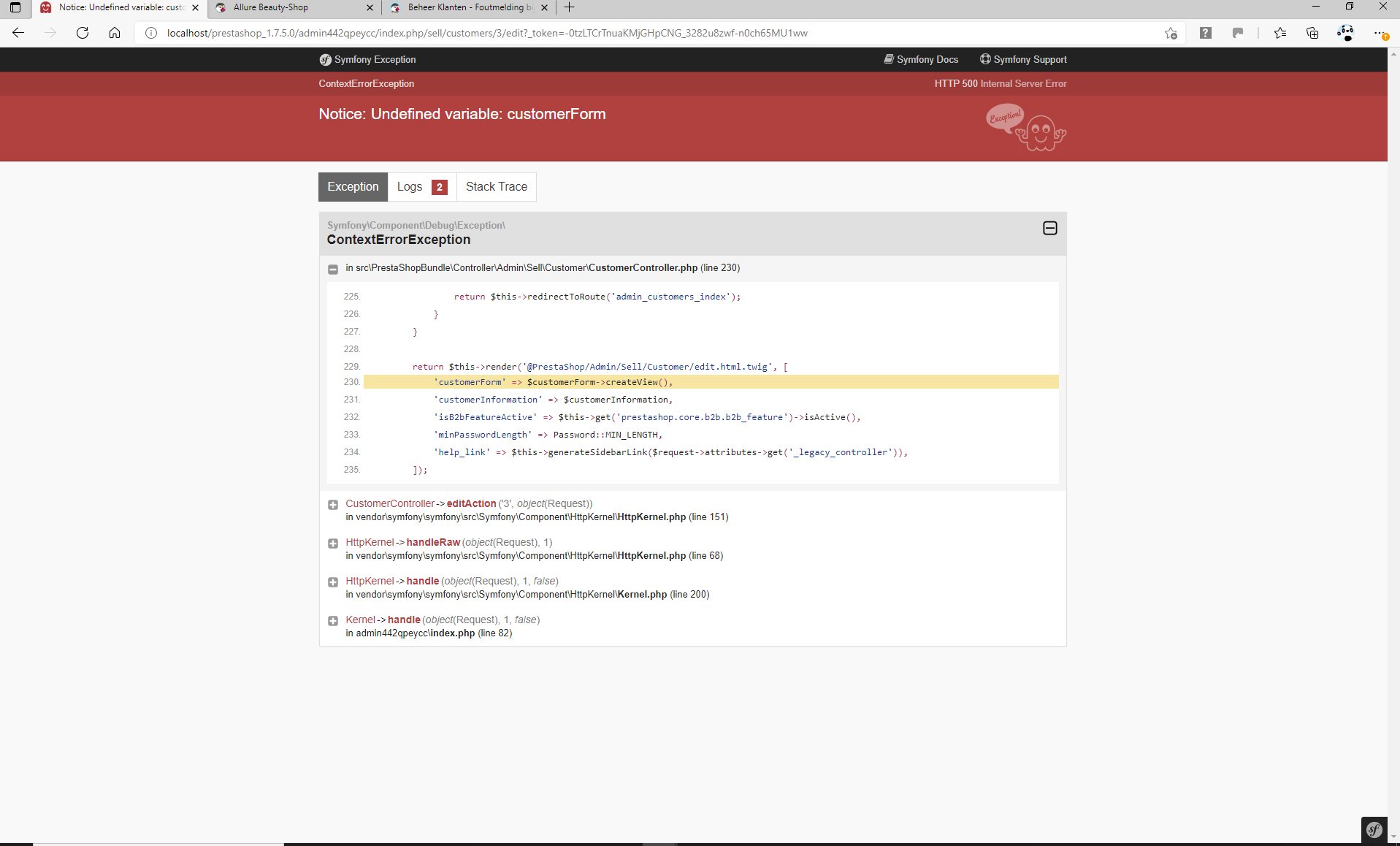 Rico_001 Posted June 15, 2021 Share Posted June 15, 2021 (edited) Goede Middag, Versie : 1.7.7.1 Ik ben sinds enige tijd bezig om een nieuwe webshop op te zetten die nog niet online staat. Bij Beheer Klanten (Klanten - Klanten) komt er een foutmelding wanneer ik iets wil aanpassen aan de gegevens van de klant. Het formulier om de aanpassingen te doen wil niet openen. Ik heb niks gewijzigd, maar ik heb geen idee sinds wanneer dit is gebeurd aangezien ik de laatste weken enkel tijd heb besteed aan het aanvullen van producten. Pas vandaag heb ik gezien dat dit niet meer werkt. Ik had die klant gegevens vroeger manueel ingegeven via het dashboard. Heeft iemand misschien enig idee wat de oorzaak zou kunnen zijn. Ik ben daarnet ook eens gaan kijken om een nieuwe klant aan te maken vanuit de frontend (inlog knop op de webshop). Wat ik ook raar vind is dat er geen adresinfo wordt weergegeven wanneer een klant wil inloggen (zie bijgevoegde foto) Bij voorbaat dank Rico Edited June 15, 2021 by Rico_001 (see edit history) Link to comment Share on other sites More sharing options...