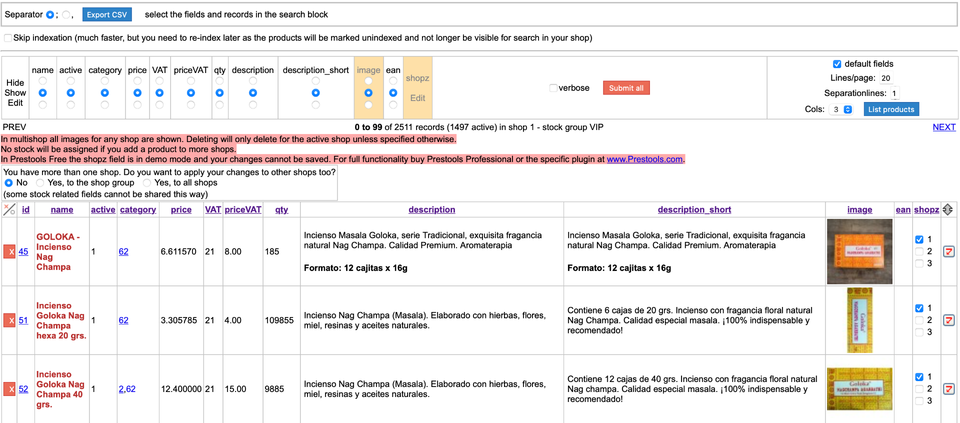 solopedro Posted June 20, 2021 Author Share Posted June 20, 2021 14 hours ago, musicmaster said: That is the mass edit/mass update function that was in the picture too. You choose Add with shop id 2 and all records on the page get shop 2 added. Standard there are 100 products on the page. But you can easily increase that to 500. At the end you need to click the "Submit all" button to get the changes implemented. Note that this is a paid function. So you need to buy a plugin. Hi Again IS this one the one I need for this task? https://www.prestools.com/prestools-suite-plugins/prestools-multishop-plugin Prestools Multishop Plugin Change which shops your Prestashop or Thirty Bees products are assigned to with this mass edit software. This is a plugin for Prestools Suite, the free tool suite for mass editing and more for Prestashop and Thirty Bees Thanks Link to comment Share on other sites More sharing options...