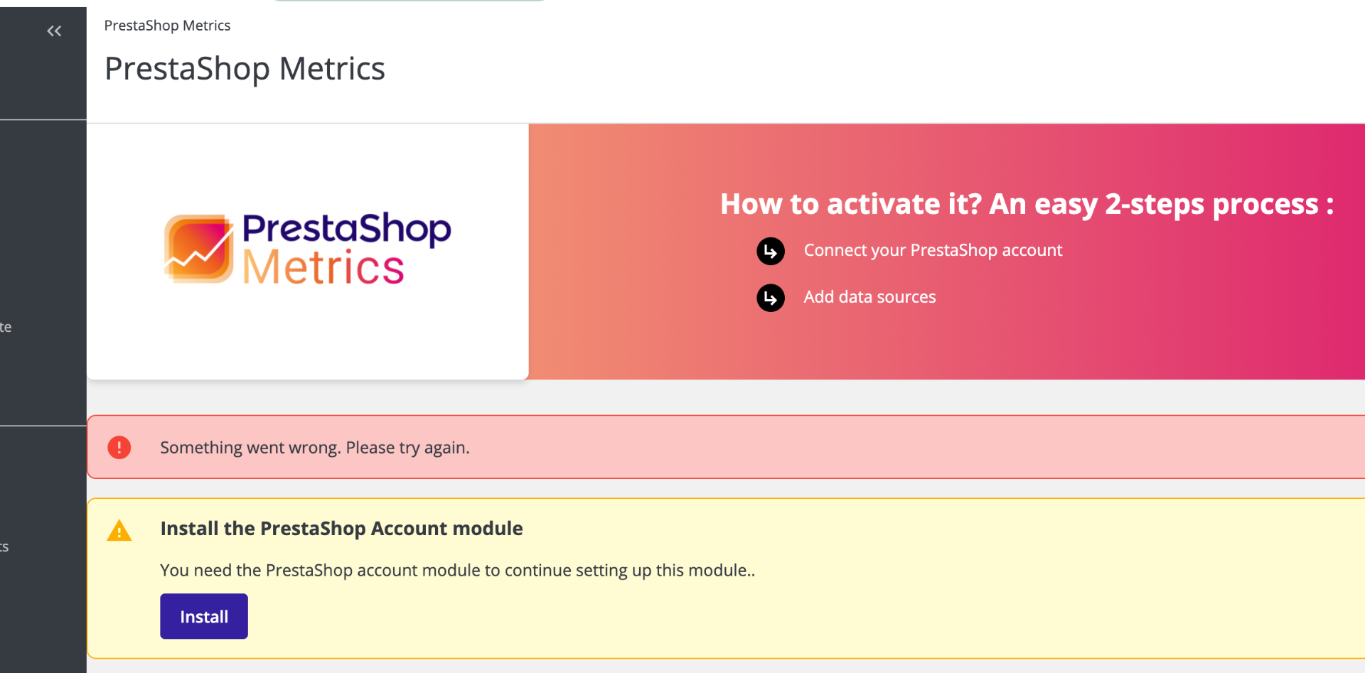 ComGrafPL Posted June 19, 2021 Share Posted June 19, 2021 Install PS account module below. You need to login to your prestashop account to use metrics module. Link to comment Share on other sites More sharing options...