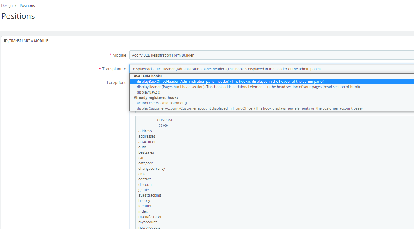 I want to place a module on the displayTop hook but if I go to the module options on the Positions settings only a handful of hooks shows up as available:
