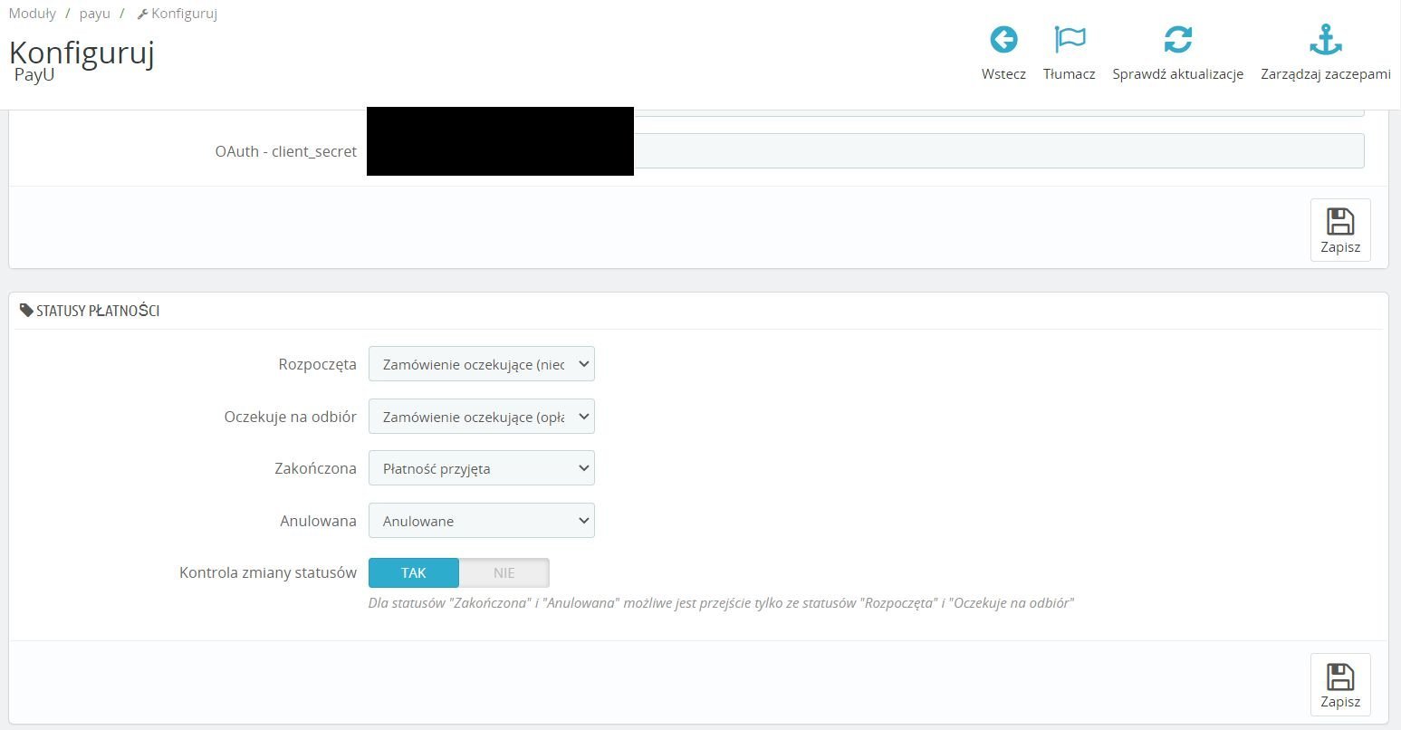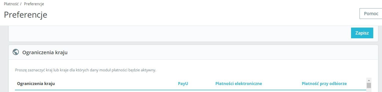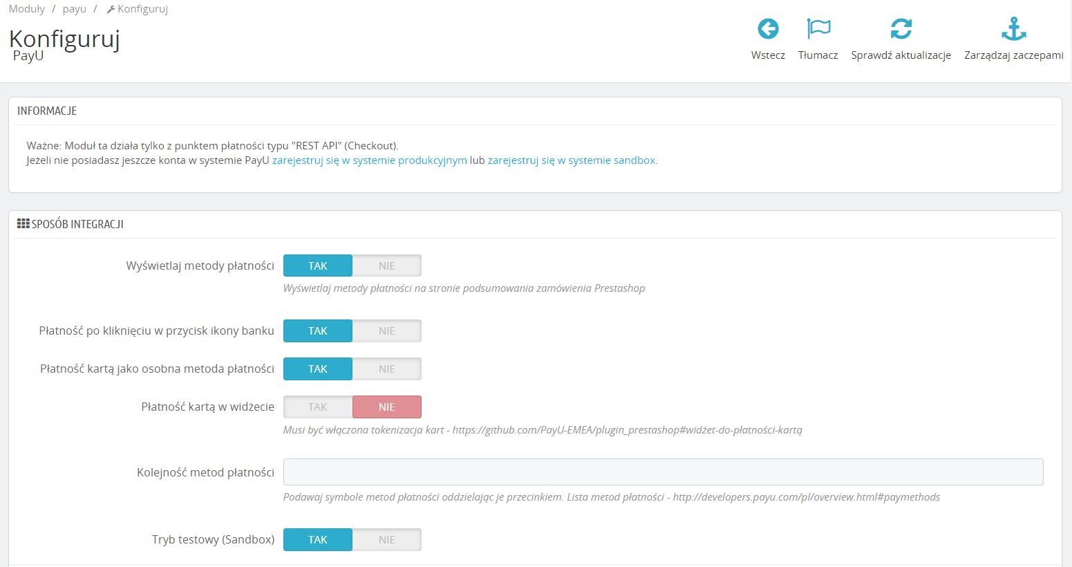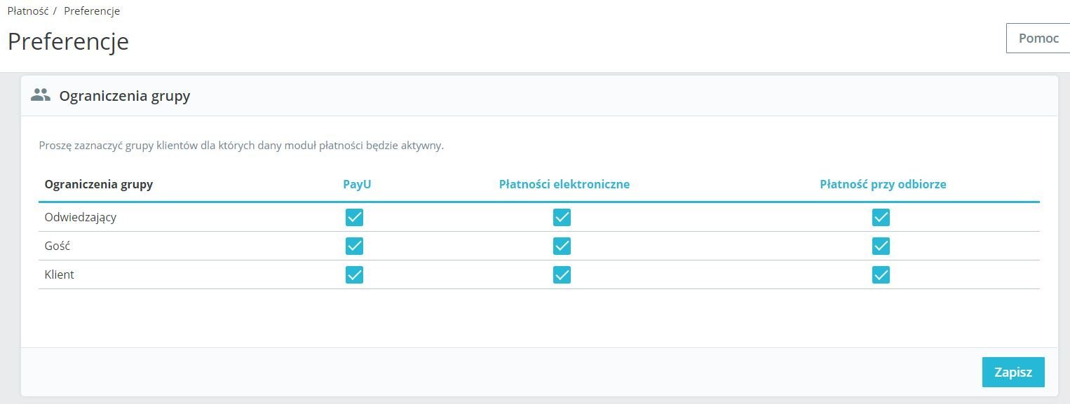 W panelu administracyjnym mojego sklepu (w Płatność/Preferencje) PayU zostało skonfigurowane tak: