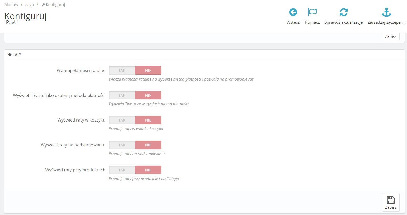 Mimo takiej konfiguracji w sekcji (Płatność / Płatności) PayU nigdzie nie widać.