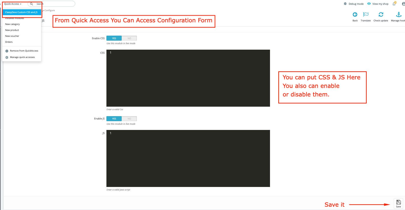 ClassyDevs Posted June 30, 2021 Share Posted June 30, 2021 (edited) Hello Developers, Sometimes you need to customise your PrestaShop theme. To customise the code of any PrestaShop themes, you have to open files from the server and FTP. It's a very time consuming and complex process. 😰 To reduce time-wasting customisation, we have made ClassyDevs Custom CSS & JS module for you. This module is completely FREE! 😃  This module allows you to customize your prestashop custom css styles and JavaScript code. Override your theme's aesthetics and add client-side functionality with this module.  Why should you use PrestaShop Custom CSS Module? The Custom CSS & JS module allows you to add extra CSS and JavaScript without deploying any code. This module is extremely lightweight, as it does not rely on any third-party libraries. This module has theme-specific JavaScript and CSS conditions. There's no need to access the server's core files via FTP. Save Valuable times.  Installation ---------------- Download Zip File Upload Module Publish  Configuration ------------------- PrestaShop 1.7.x  Settings --------------- Go to PrestaShop Admin Dashboard Quick Access > ClassyDevs Custom CSS & JS    You will get two text-areas if you use this module. One is for CSS and the other is for JS. You can enable and disable CSS and JS Text-areas fields. This module adds CSS and JS without requiring any code deployment since it stores CSS and Javascript in variables rather than files. Download Module from here  👇👇 DOWNLOAD MODULE classy_custom_js_cs.zip  Is there any feature and suggestions that you want to get in this module? Please comment below.  Regards, ClassyDevs Team  Edited October 23, 2022 by ClassyDevs update contents (see edit history) 4 1 Link to comment Share on other sites More sharing options...