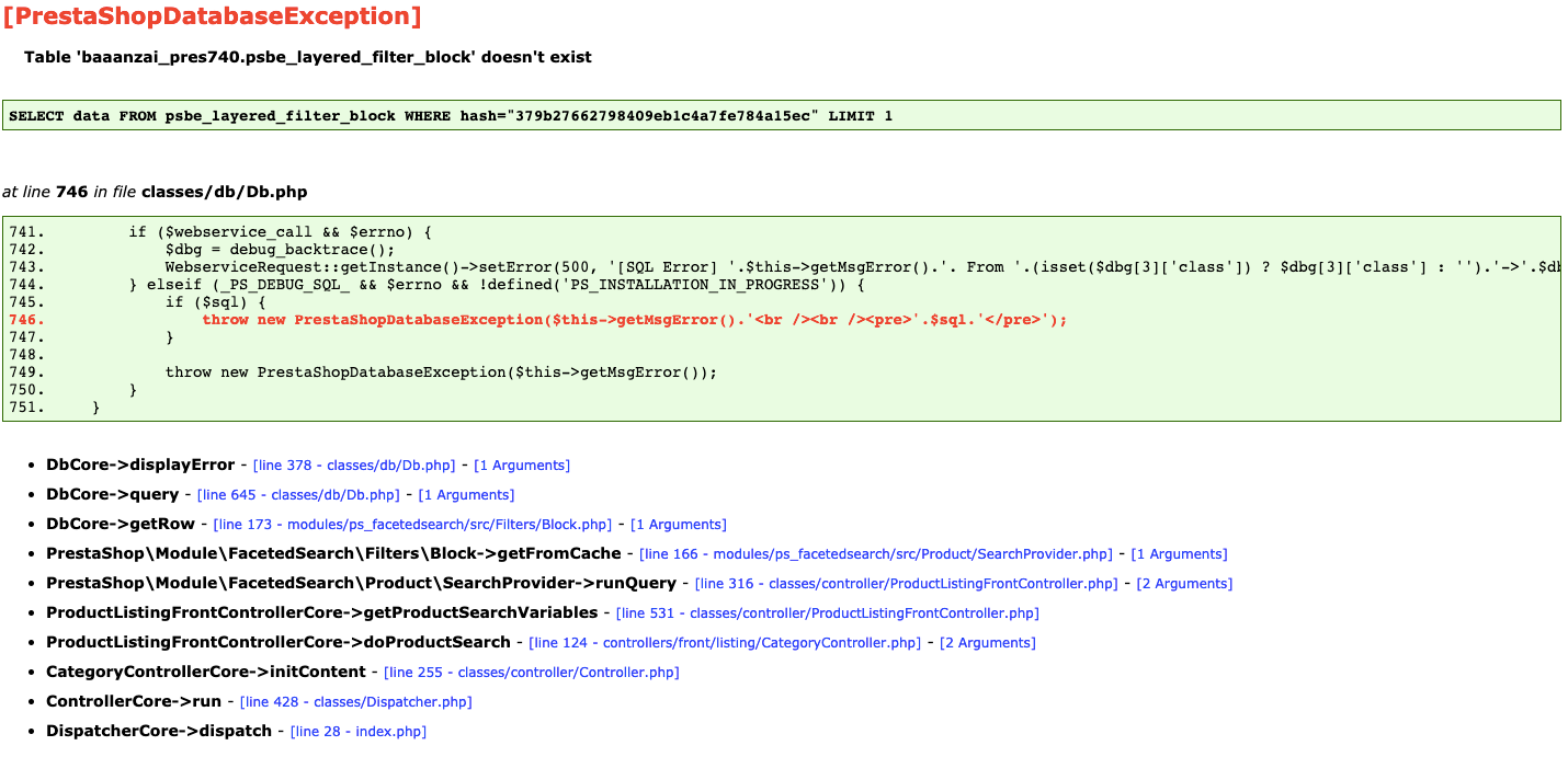 Juanjomg Posted July 1, 2021 Share Posted July 1, 2021 Muy buenas. En el error que adjuntas te indica que no existe la tabla psbe_layered_filter_block, tendrás que entrar en la base de datos y confirmar si existe. Esta tabla es usada por el módulo búsqueda por facetas, y parece que para la versión 1.7.4.3 de prestashop no existen esas tablas. Lo más seguro es que hayas instalado algún módulo que entre en conflicto, las soluciones que tienes es crear las tablas que te falten o desactivar el módulo que te esté dando problemas. Un Saludo. Link to comment Share on other sites More sharing options...