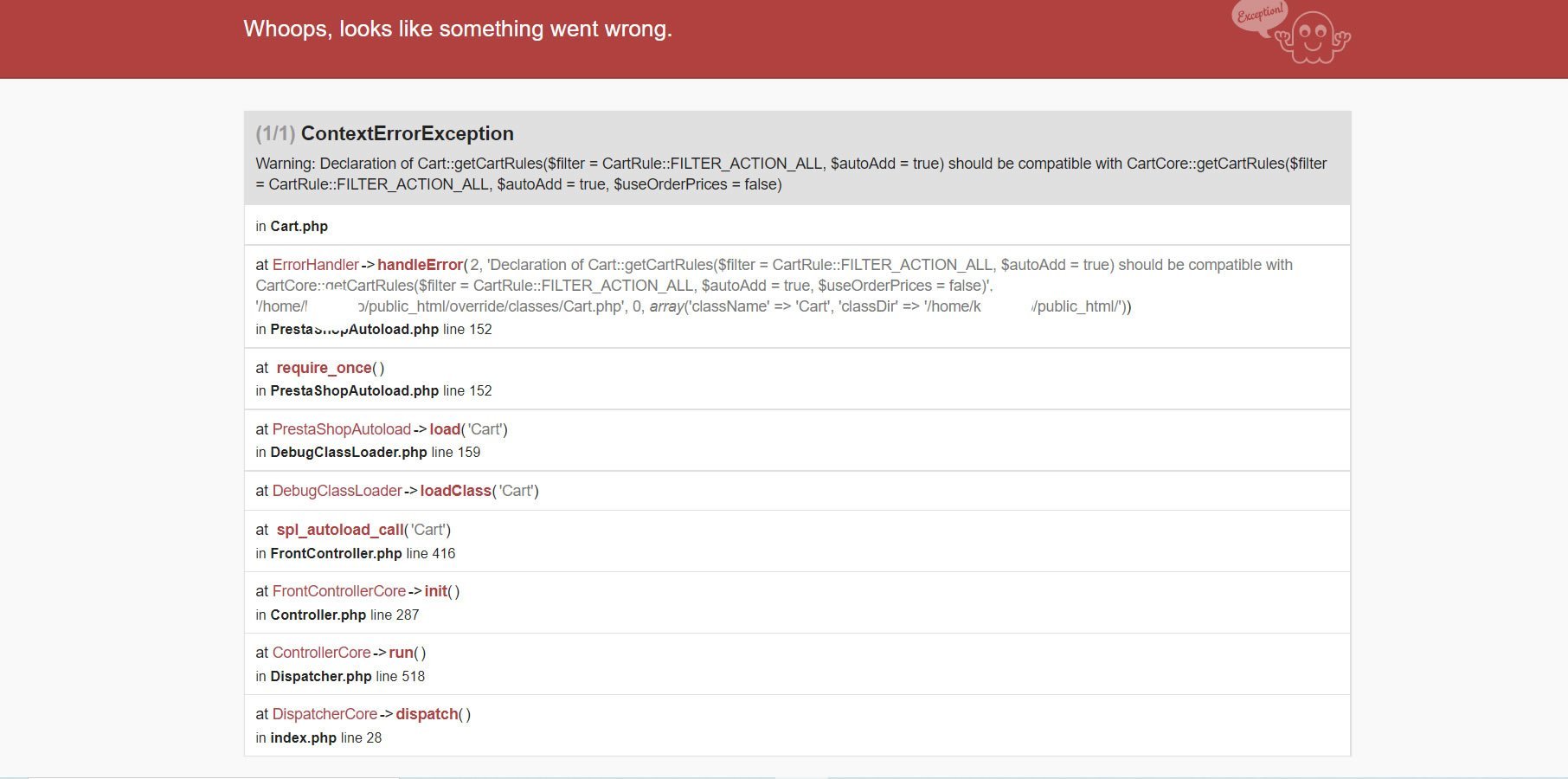 w3bsolutions Posted July 12, 2021 Share Posted July 12, 2021 (edited) 21 hours ago, jonysi_d said: Hola, acabo de actualizar la tienda onlinecon el modulo de actualizar y me aparece error en el back office al modificar productos y en la front cuando pongo el DEBUG en ON Adjunto captura a ver si sabeis porque me aparece este error. este error es de la parte publica, pero el error del back office el problema es que hay muchos enlaces que no funcionan tanto en los pedido como los productos, no puedo guardar los cambios de los productos modificados, etc... gracias Elimina o renombra /override/classes/Cart.php y se debería ir el error. Si necesitas la funcionalidad modificada en esa función, reescríbela (se queja de que actualmente no tiene el mismo número de parámetros que la función por defecto a la que sobreescribe) para que la definición de la función (número de parámetros, sobre todo) coincida con la original. Pero como solución rápida con renombrar el archivo se debería ir el error. Edited July 12, 2021 by w3bsolutions (see edit history) Link to comment Share on other sites More sharing options...