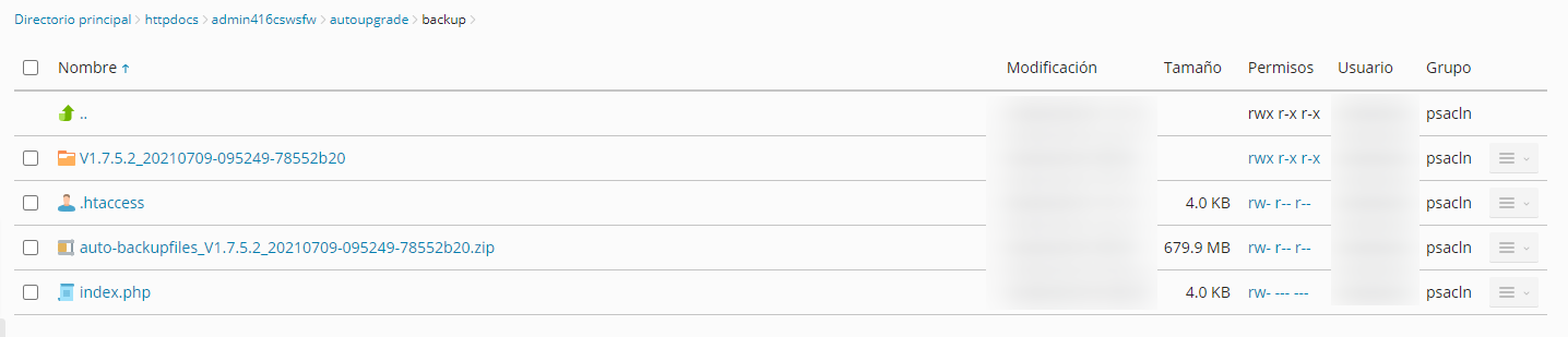 Loadinges Posted July 30, 2021 Share Posted July 30, 2021 (edited) Buenas, Las copias que genera el sistema "autoupgrade" de Prestashop no son muy fiables, es recomendable usar un sistema de copias externo. No obstante llegado este punto, puedes restaurarlo de forma manual, Prestashop almacena la copia en la carpeta: /adminxxx/autoupgrade/backup/ La carpeta /adminxxx/ tienes que reemplazarla por tu carpeta admin correspondiente. Dentro de la carpeta /backup/ encontraremos un zip con los ficheros y una carpeta con la copia de la base de datos, un ejemplo en la captura adjunta. Eliminando todos los archivos de Prestashop, subiendo ese zip ya tendríamos los archivos previos a la actualización. Luego desde phpmyadmin o el gestor de bases de datos que utilice tendría que restaurarla con el fichero .sql que se encuentra en la carpeta /adminxxx/autoupgrade/backup/V1.x.x.x_xxxxxxxx/ Edited July 30, 2021 by Loadinges (see edit history) Link to comment Share on other sites More sharing options...