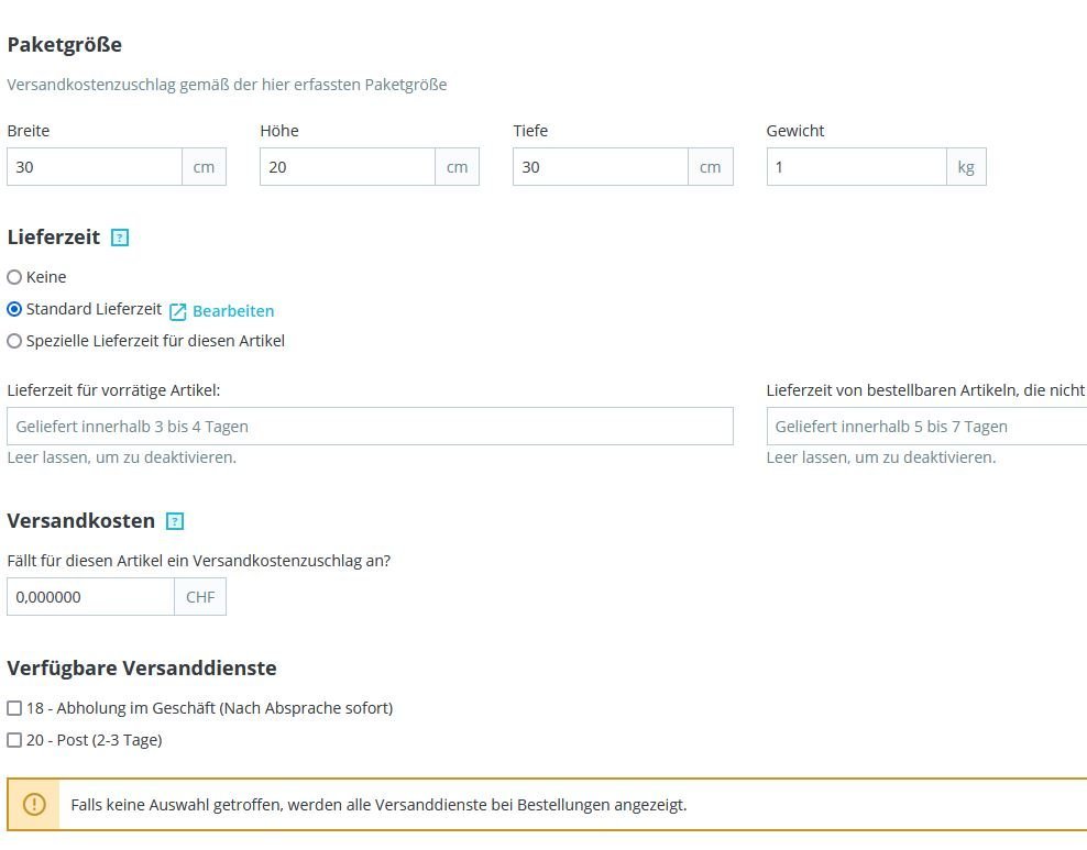rictools Posted July 17, 2021 Share Posted July 17, 2021 Und auch richtig dem Versandgebiet zugeordnet? Bei den Produkten hast du keine (oder alle) Versanddienste ausgewählt? Um herauszufinden wo ein Fehler liegen könnte ist einfach Input, Input, Input erforderlich. Bisher hast du die wichtigen Screenshots nicht gezeigt bzw. der wo steht "[keine Angabe] CHF" weist auf einen möglichen Fehler hin. Link to comment Share on other sites More sharing options...