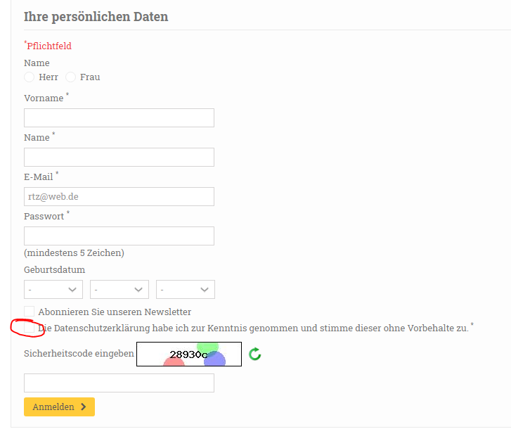 rictools Posted July 16, 2021 Share Posted July 16, 2021 (edited) Nach meiner Kenntnis gibt es keine Notwendigkeit, dem Kunden eine Zustimmung abzuverlangen (die in den meisten Fällen sowieso eine Lüge wäre denn wer nimmt schon diese ellenlangen Textwüsten tatsächlich "zur Kenntnis"). Auf jeden Fall sollte "Datenschutzerklärung" aber verlinkt sein. Auch ob du an dieser Stelle unbedingt ein Captcha brauchst oder lieber mit ein paar Spam-Anmeldungen leben kannst (wenn so etwas überhaupt passiert, ist für Spammer doch überhaupt nicht interessant) könntest du dir überlegen, jeder Kunde den man dadurch verliert kostet Geld. Edited July 16, 2021 by rictools (see edit history) Link to comment Share on other sites More sharing options...