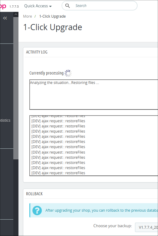 gray Posted July 16, 2021 Share Posted July 16, 2021 How long does roll back take, from 1.7.7.5 to 1.7.7.4 After upgrading to 1.7.7.5 I have had a few bugs ? So I decided to rollback. It has been running for 12 hours, and it only ever displays on continual rolling basis [DEV] ajax request : restoreFiles Is it normal to display this text, and how long should a roll back take ? TIA Link to comment Share on other sites More sharing options...