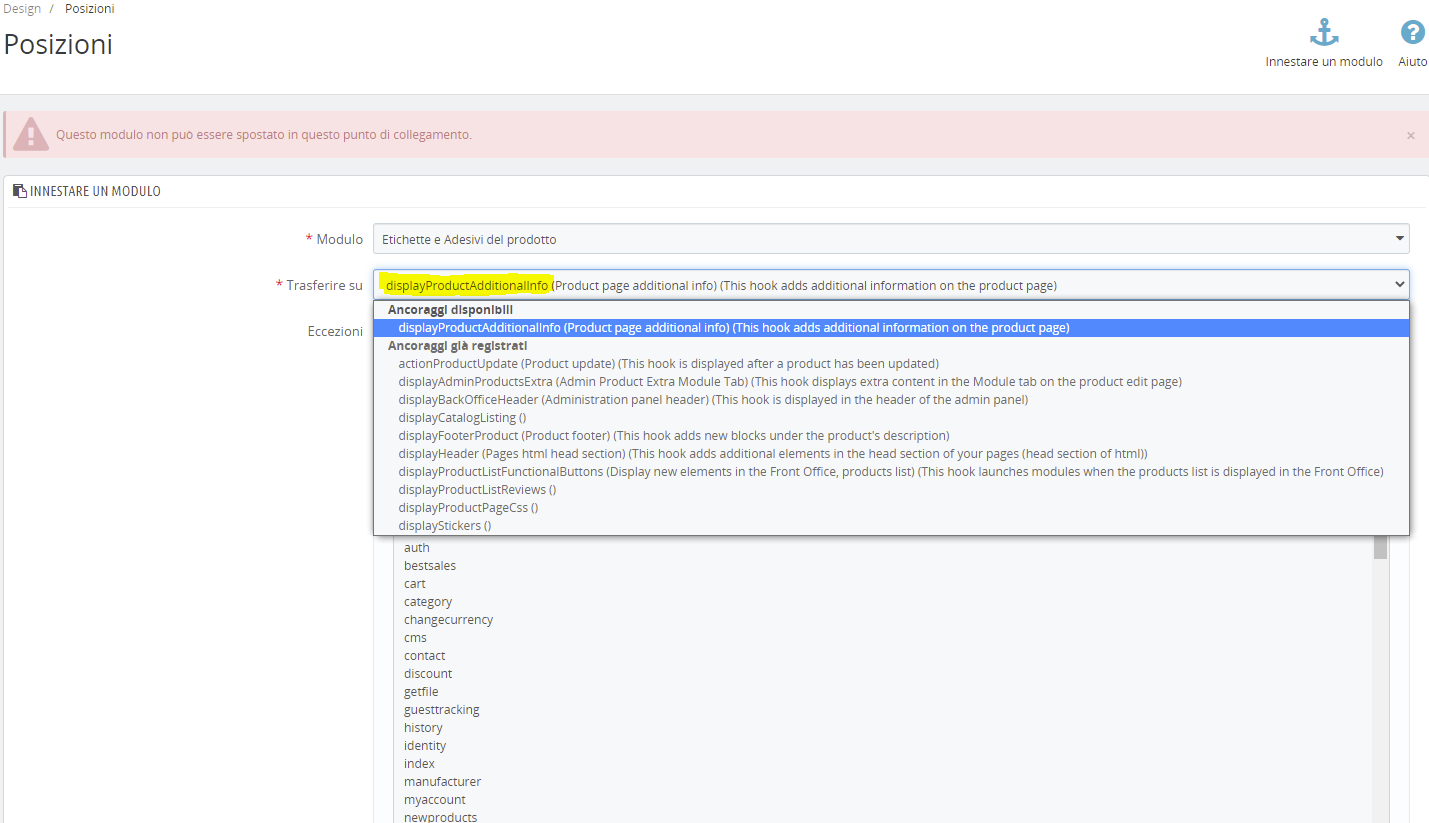 Fabrizio Carloni Posted July 16, 2021 Share Posted July 16, 2021 (edited) Ciao a tutti, sto cercando di innestare un modulo su displayProductAdditionalInfo ma quando salvo ricevo l'errore "Questo modulo non può essere spostato in questo punto di collegamento". C'e' un trucco per forzare questo spostamento? Grazie in anticipo per l'aiuto, Fabrizio. Edited July 17, 2021 by Fabrizio Carloni (see edit history) Link to comment Share on other sites More sharing options...