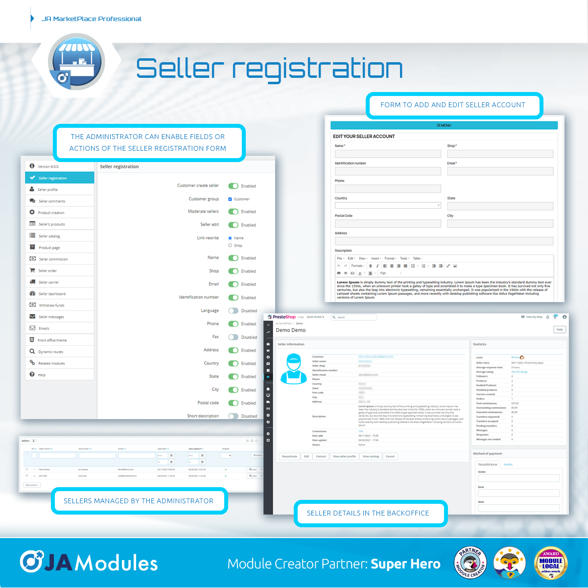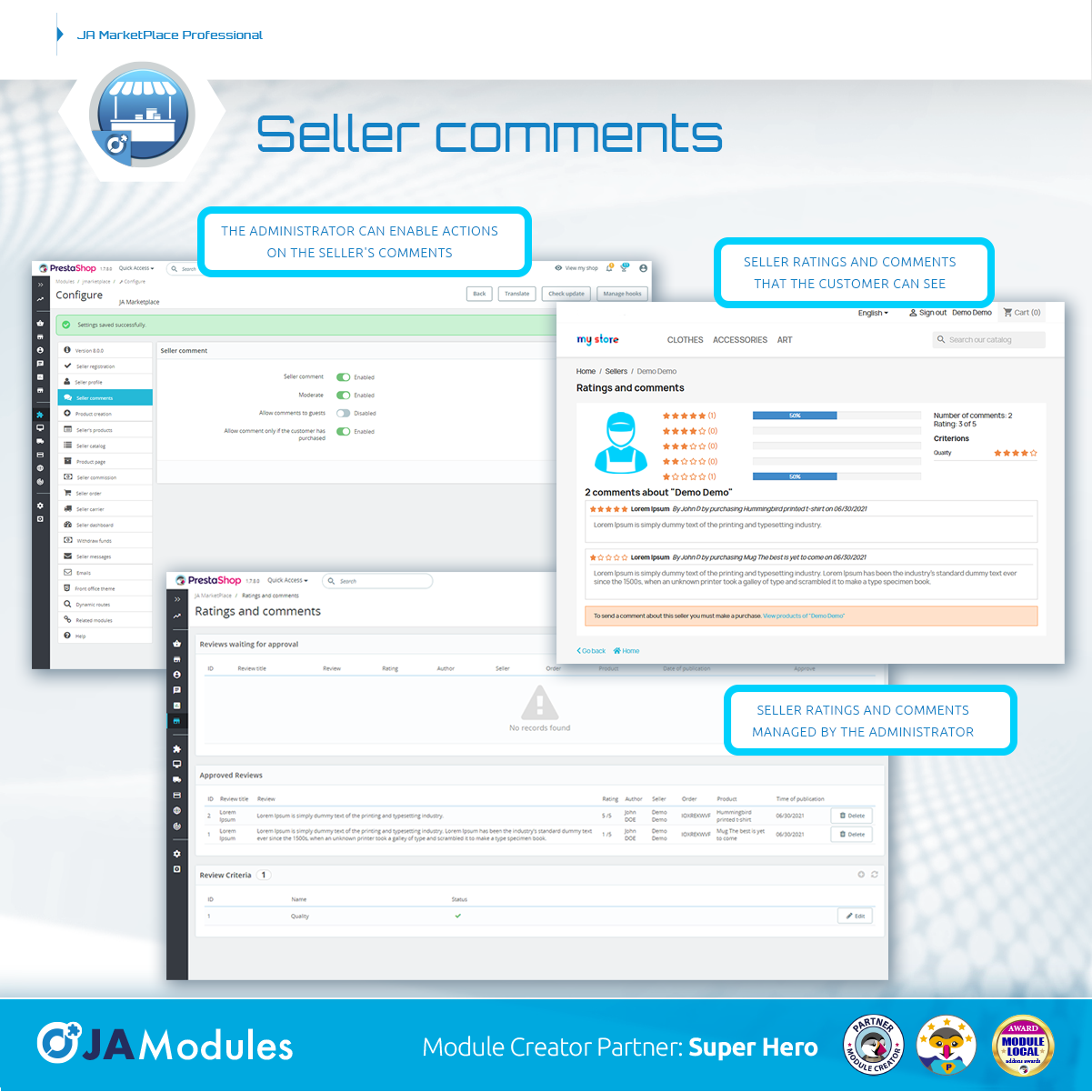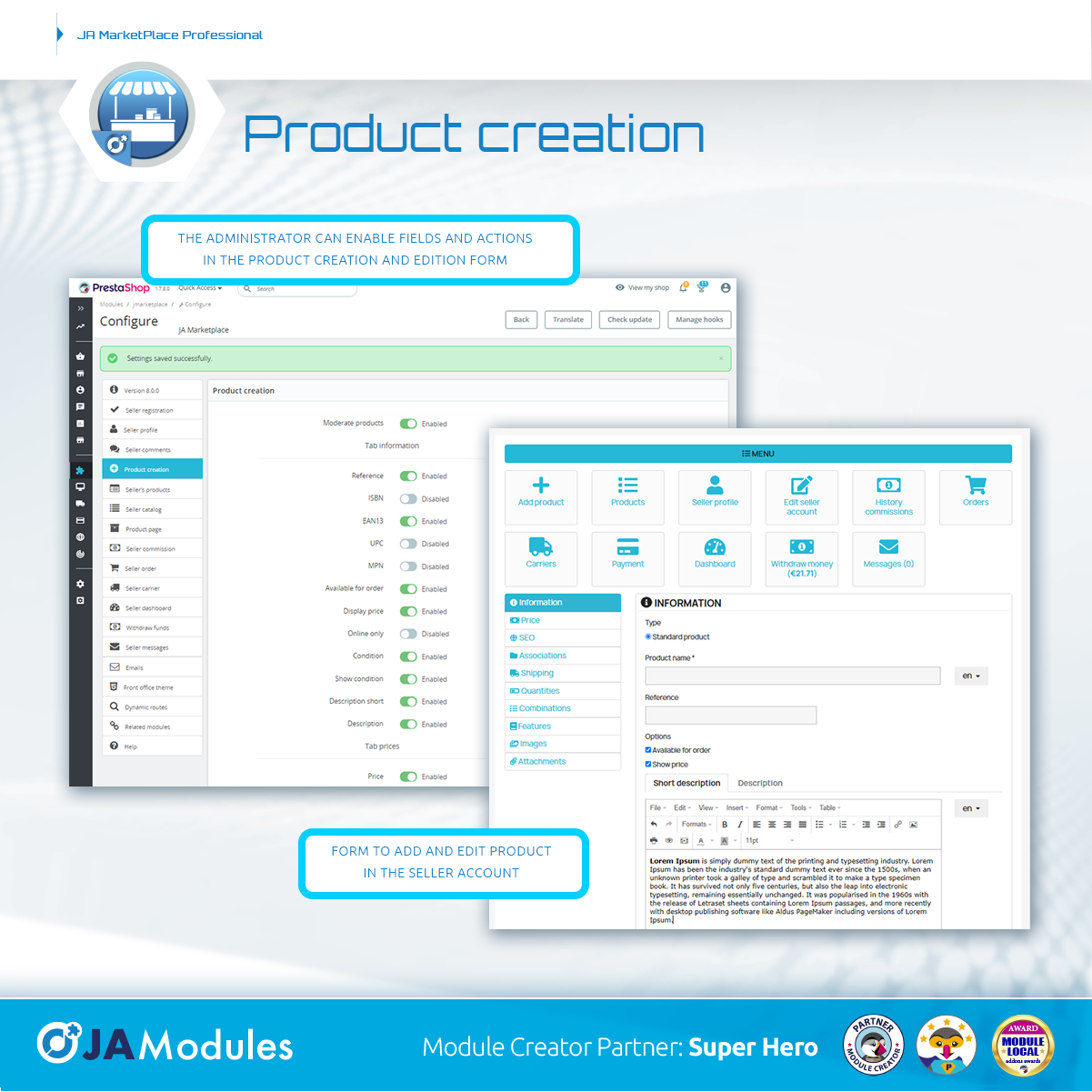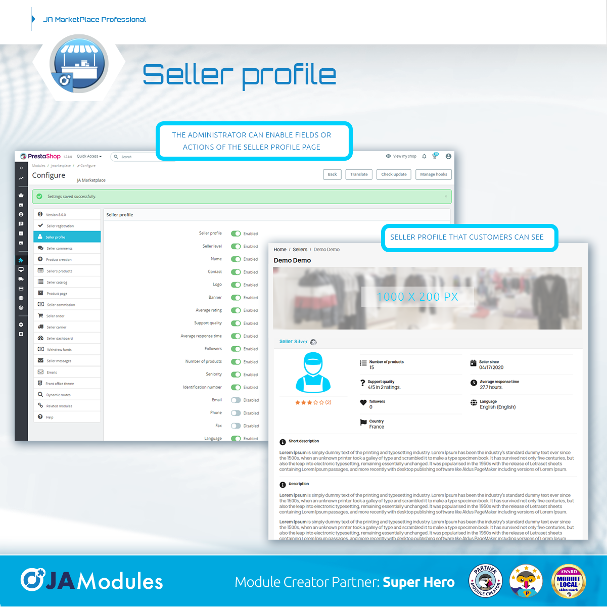 JA MODULES Posted July 20, 2021 Share Posted July 20, 2021 ⭐⭐⭐⭐⭐ Double major update for JA Marketplace Very important update of our trusted marketplace module. Multiple shipping selection included in base, seller levels, category filter in seller catalog, and much more. On the one hand, we have been working on version 7.3.0 to add the possibility that the base module has multiple shipping selection. A highly demanded but very complex functionality to develop. This means that the admin can now enable multiple shipping selection from the module settings with the main objective of allowing customers to select a shipping option for each package in the shipping selection block of the checkout. If this option is not activated, the functionality of not allowing adding products from different sellers to the shopping cart is maintained. In the cart it is now possible to enable the seller's name in each product line. At the same time, we have been working on version 8.0.0 that brings a lot of new features that will surely interest you. In PrestaShop 1.7 onwards, the "displayAdminProductsMainStepLeftColumnMiddle" hook is now being used to display seller information on the product management page in the Backoffice. Technically, we are now using Bootstrap's "card" component on the product page to display seller information in an improved format. The admin can now see the seller information in the customer tab (Backoffice). Now the administrator has the possibility to enable the related products so that the seller can select them from the creation and edition of a product in the seller account. In this way, accessories or related products can appear on a product page if the active template allows it. The "displayFooter" hook has been removed and we are now using the Media::addJsDef function to insert JavaScript variables into the page. In this way, these variables are available in JavaScript files using the new PrestaShop functions. Major changes have been made to the layout of the seller profile. The table format has been removed and is now more adaptable to all devices thanks to the use of containers. Added 6 new hooks on the base module. Most of them related to the new changes in the seller's profile. This change affects all modules that are hooked on the seller's profile. All our modules will be revised shortly to adapt to these new changes. If you have any problems, do not hesitate to contact the technical support center. Added "row" class in product containers. This affects the product blocks that are on the seller profile and seller catalog page. It is now possible to enable a filter by categories in the seller's catalog. Added SellerPaymentMethod class. This class helps improve the seller's commission payment method management system. The administrator can now modify the payment method chosen for each seller. You can even modify the details for the payment. Added a new Backoffice controller to manage payment methods for commissions. A new attribute has been added to the Seller object. Now it is possible to enable the short seller description which can be very useful for some places in the template. There were important changes in the moduleRoutes hook where the controllers that have this functionality were correctly defined. Related to this point, the unnecessary getJmarketplaceLink function that allowed to call these dynamic routes in previous versions of PrestaShop was removed. There have also been major changes to the module's configuration. All the forms and tabs on the configuration page have been restructured to make it more understandable. In principle, each tab now corresponds to a single page or group of functions. Now we are using PrestaShop's GroupBox feature to allow the admin to select the customer groups that can become a seller. The description attribute of the configuration form fields were changed to the "hint" option that allows adding a balloon with the explanatory information of the field within the Helper Forms. This allows the form to be better viewed by the administrator. With this change was used to improve the explanations of each field. Everything to make life easier for the administrator. There are now 18 tabs in the module settings: Version 8.0.0 Seller registration Seller Profile Seller Comments Product creation Seller's Products Seller Catalog Product page Seller commissions Seller orders Seller's Carriers Seller dashboard Withdrawal of funds Seller Messages Emails TFront Office Theme Dynamic routes Related modules Help In the "Version 8.0.0" tab, the contact information, video and description of the add-on are kept. In the tab "Seller registration" there are a lot of options that mainly allow you to enable and disable the fields of the seller account creation and editing form. In the tab "Seller profile" you can enable the information that users and customers can see in the seller's profile. In "Seller Comments" the form that was in the "AdminSellerComments" controller has been moved, where it is possible to enable some functions related to the comments that sellers can receive. In the "Product creation" tab, the form that allows enabling and disabling the information that the seller can add to their products is maintained. The "Seller's Products" tab is new and allows you to enable or disable a lot of options and actions on the page that allows the seller to manage the products. The "Seller Catalog" tab is also new and allows you to enable or disable various options on the seller's catalog page. For the product page itself there are also news. There is a new tab that allows you to enable or disable all the seller's information. In the "Seller commissions" tab, the options related to the seller's commissions have been added, I refer to the fixed commission, variable commission, commission assignment, and so on. A new "Seller Orders" tab has been added to enable or disable the various options and functions that appear on the seller's order management pa