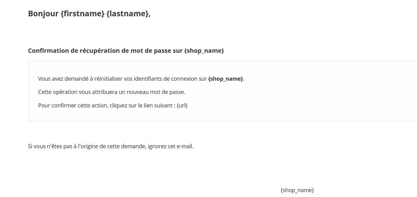 Email de changement de mot passe reçu par le client qui ne contient pas le lien, ni le nom etc !