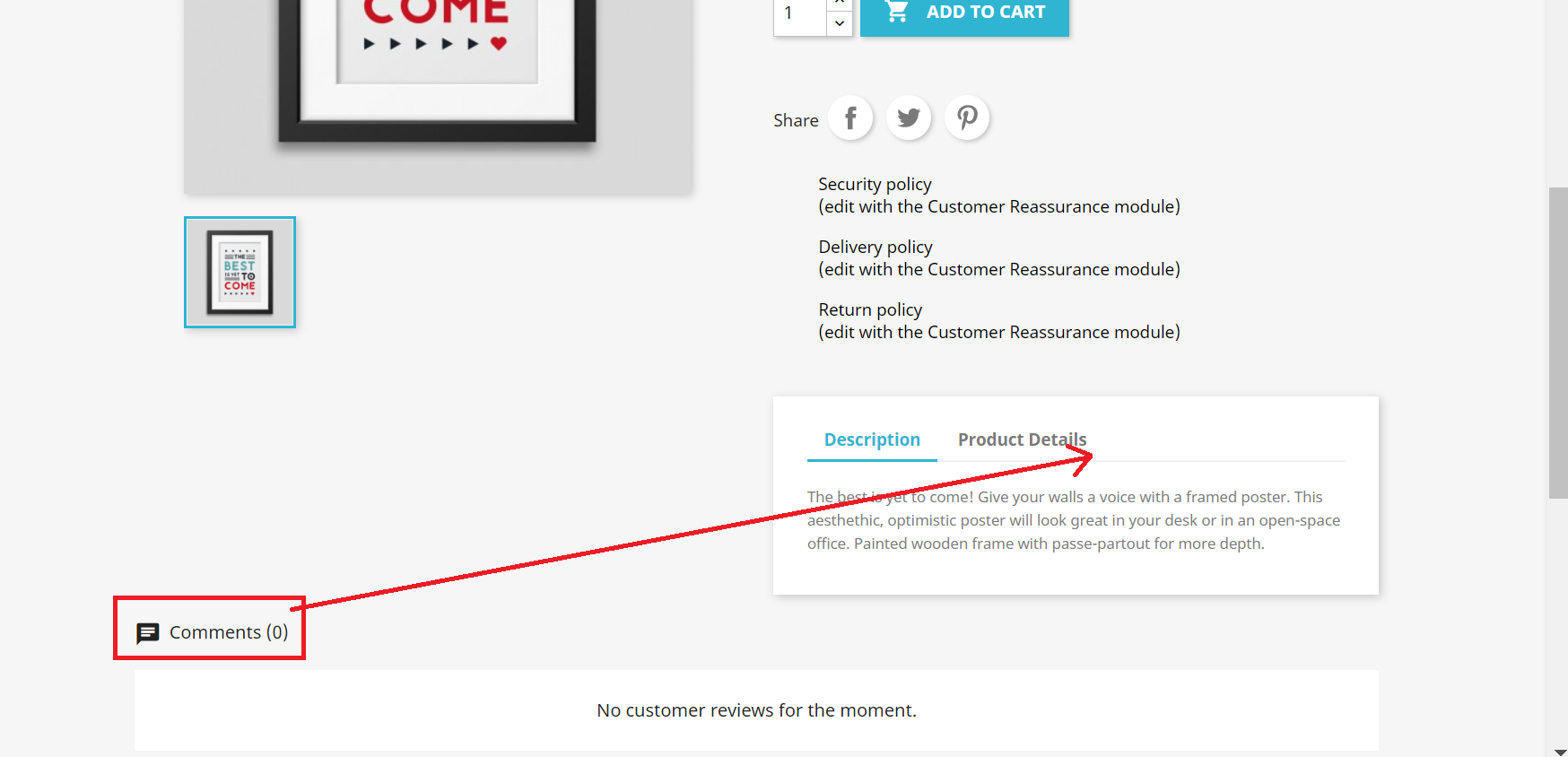 The module "Product Comments" by PrestaShop does not work properly because comments are visible at the end of product page. Comments should be visible together with a describtion and product details tabs.