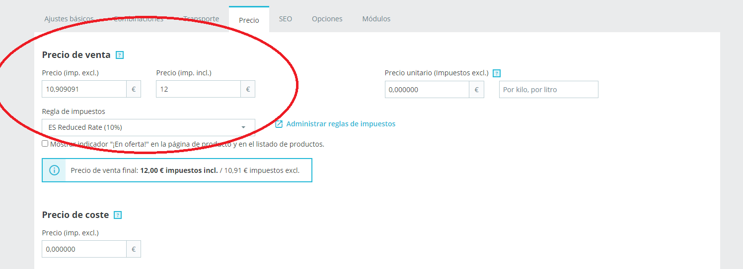 rma Posted July 26, 2021 Share Posted July 26, 2021 Hola, estoy teniendo problemas para configurar los precios de los productos debido al cálculo del IVA que se está realizando en PrestaShop v1.7.72. He visto que no soy el primero que tiene este problema, pero a pesar de haber leído diferentes opciones sigo sin lograr que los precios concuerden. Como se aprecia en la imagen y si no estoy equivocado, la regla de impuestos que estoy seleccionado es el IVA español del 10%. El 10% de 12 es 1,2 y 12-1,2 es 10,8. ¿Por qué se está aplicando el 9,083333333333333333333333% en vez del 10%? Si la configuración no cuadra, cuando se va a realizar una compra, pues tampoco cuadra. Ese 1,09 es efectivamente de haber aplicado el 9,083333333333333333333333%. El único sitio donde he visto algo de configuración es en la sección "Configurar" en "Parámetros de la tienda"->"Configuración". Si no me he equivocado probando, he configurado diferentes combinaciones pero ninguna ha aplicado bien el IVA. También en la sección "Personalizar" y en "Internacional"->"Impuestos" he comprobado si el porcentaje de los impuestos está bien, y lo está, simplemente pone un 10. He configurado esa tasa del 10% al porcentaje que me viniese bien para que el cálculo saliese como quiero que salga, pero evidentemente esto es una chapuza, con un producto funciona pero con varios productos ya no cuadra por 0,1€ o 0,2€.... Creo que funcionaría bien si me dejase meter más decimales, pero solo admite 6 caracteres, aunque sigo pensando que esto es una chapuza. Yo creo que hay algo por ahí en la configuración que "choca" con el tema del IVA pero no doy con ello. Pero por vuestra experiencia, ¿podéis ayudarme a configurarlo bien? Alguna pista o algo que tenga que mirar sí o sí y no lo he puesto aquí. Preferiría no tener que tocar código, pero si no queda más remedio tampoco me importa. Si necesitáis más información la puedo aportar sin problemas, muchas gracias de antemano. Link to comment Share on other sites More sharing options...
