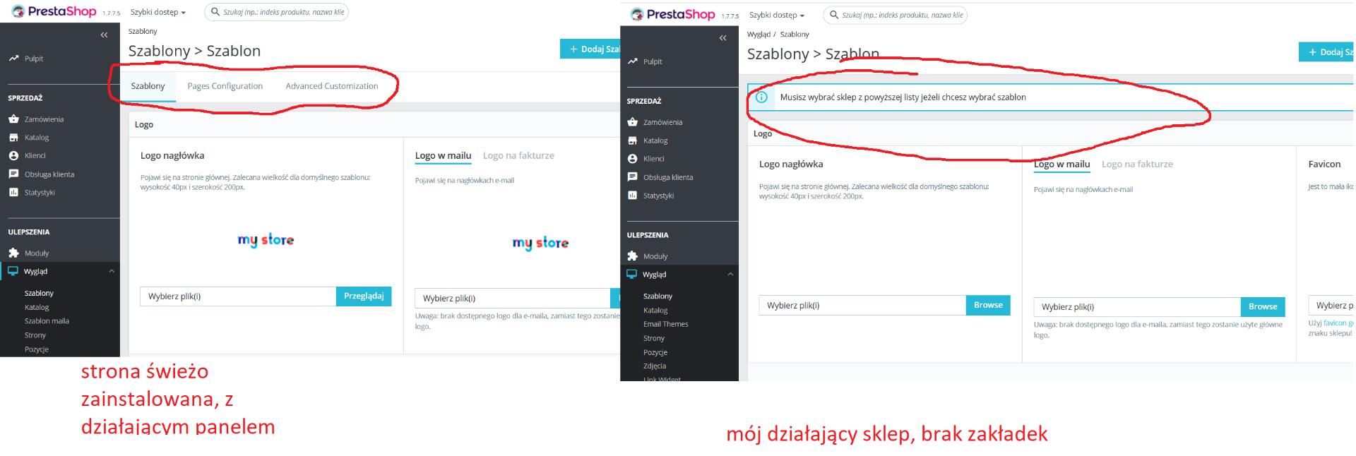 mefiu Posted July 29, 2021 Share Posted July 29, 2021 Witam, Mam postawiony sklep na presta 1,7, instalowany przez Informatyka kiedyś hen hen daleko. Na innej domenie stworzyłem sobie child theme i edytowałem pare rzeczy, jednak okazuje się że na swoim sklepie włąściwym nie mam zakładek w panelu Admina -> wygląd -> Dokładnie tych: Szablony/Page Configuration/Advanced Customization dalej, wszedłem w Advanced customization w nowym, działającym sklepie, skopiowałem url i podmieniłem nazwe strony, otrzymałem takie coś: Próbowałem podmieniać pliki jednak strona mi się wywalała, wersje presty i szablonów są te same na obu sklepach Link to comment Share on other sites More sharing options...