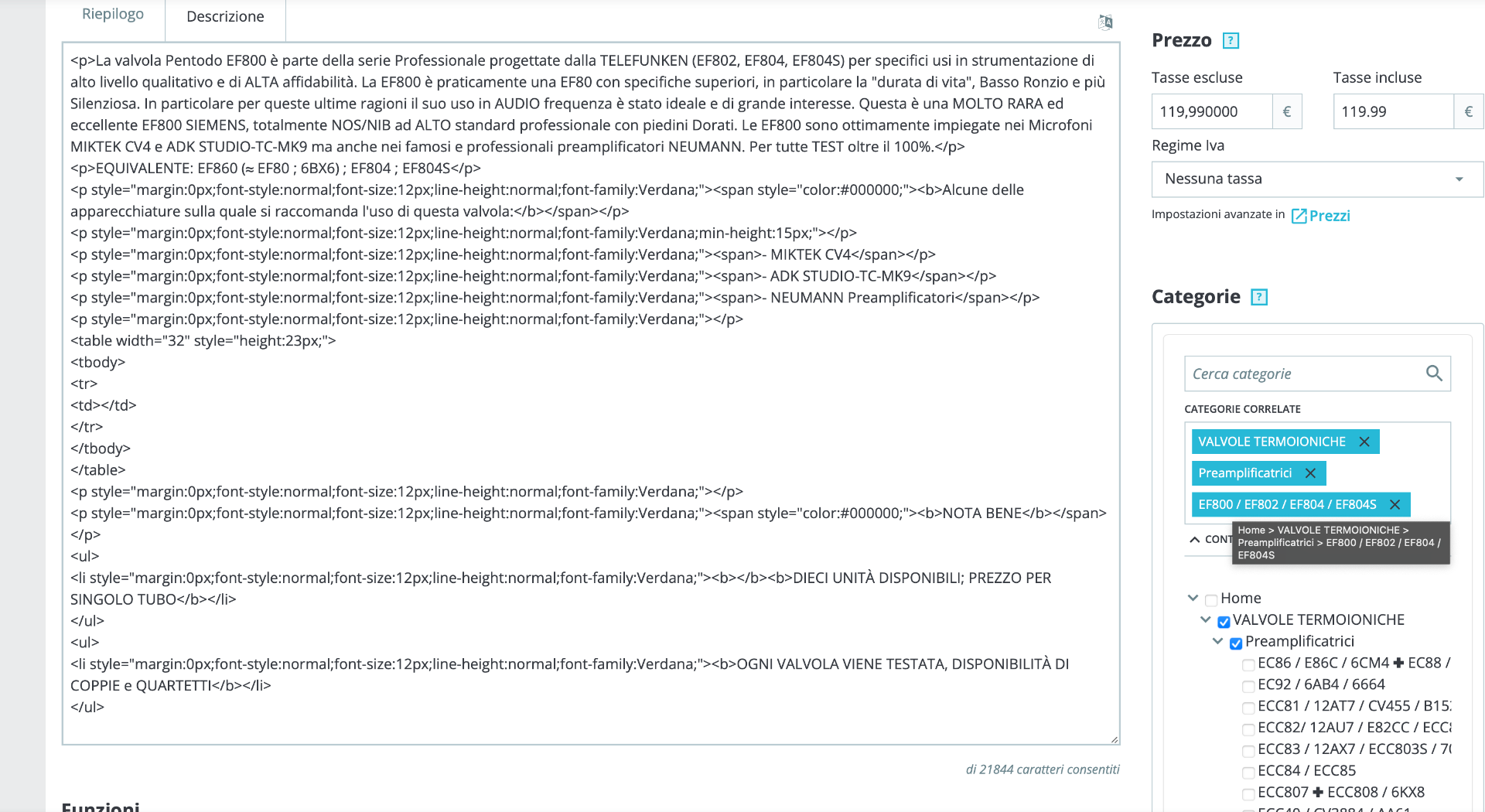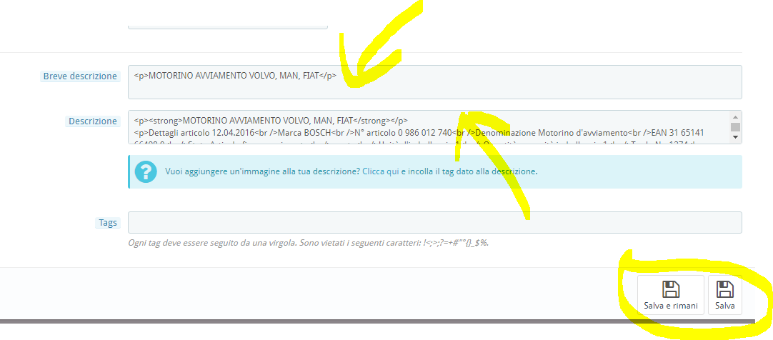 Antonio68 Posted November 11, 2023 Share Posted November 11, 2023 Buongiorno a tutti Signori, scrivo in coda a questo topic perchè ho un problema con il mio Presta che credo sia inerente a quello che qui si è discusso circa 2 anni fà. Premetto che sono piuttosto impreparato dal punto di vista informatico per non dire so pochissimo ma ho il mio web-shop su questa piattaforma e da un paio di giorni, di punto in bianco (o magari ho fatto qualcosa io di sbagliato di cui non mi sono reso conto...), l'EDITING nella scheda prodotto si è "perso", "sparito" o non so come definirlo, al posto delle mie descrizioni scritte con scrittura normale, parti in neretto, colorate, etc...appare nel modo che vedete nelo screenshot allegato e così capirete certamente meglio di che sto parlando! ...Aggiungo che il problema sta solo nei campi "Riepilogo" e "Descrizione", tutto il resto va bene e, la parte Front-end del sito funziona correttamente. Non so proprio come risolvere il problema!... Ho già cancellato più volte la "cache" dal mio hosting (Siteground) e ho fatto pulizia nel browser (Safari) di tutta la cronologia che, come sapete, in questo browser, è come azzerare tutto; NIENTE il problema continua! Potete aiutarmi?...dirmi che fare?... Però, vi prego, dovete guidarmi come un bambino di due anni :-)) .... sono abbastanza impreparato e impacciato dal punto di vista informatico, quindi se usate termini specifici e meglio che mi diciate anche dove devo mettere le mani. GRAZIE mille a tutti e attendo Vostre risposte anche perchè così non riesco a lavorare... Antonio Link to comment Share on other sites More sharing options...