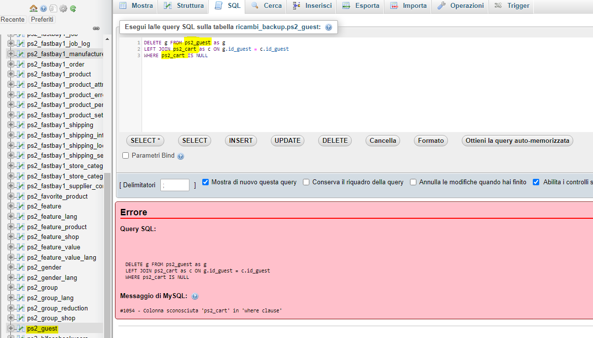 braccetto Posted August 10, 2021 Author Share Posted August 10, 2021 19 hours ago, Fabry said: Ciao Braccetto :-)...lo sapevo che c'era di mezzo qualche tabella...no no i 17K di prodotti non portano il db ad un Gb Allora...intanto ottimizza quel db ma prima "svuota" ( non cancellarle!) le tabelle dei dati statistici..vai tranquillo puoi svuotarle: ps_connections e ps_connections_source poi devi andare lanciare una query SQL sul database dal pannello del tuo phpmydamin per pulire la guest ma senza perdere le entry dei carrelli...ma occhio al prefisso delle tue tabelle perché potrebbe essere diverso quindi sostituiscilo: DELETE g FROM ps_guest as g LEFT JOIN ps_cart as c ON g.id_guest = c.id_guest WHERE ps_cart IS NULL ma prima di eseguire queste operazioni fa backup del database vedrai che il backoffice risulterá piú snello:-) Per il resto beh difficile dire cosa causa il problema senza metterci mano. certo se da un giorno all'altro é uscito il problema qualcosa é cambiato o sulla piattaforma o sul server ciao Ciao Fabry! allora le tabelle ps_connections e ps_connections_source le ho svuotate senza problema. Per quanto riguarda la query mi esce fuori un errore, ho fatto qualche errore? ho rinominato il prefisso in ps2 perchè li ho cosi, ti allego la foto 18 hours ago, Danny said: @braccetto secondo me la soluzione è aggiornare. La situazione potrebbe essere talmente compromessa che non te la cavi con una pulizia delle tabelle. Quello che poi recuperi in snellezza alla fine l'avresti con un aggiornamento e ottimizzazione. Altrimenti stai snellendo un carrozzone. E tra sei mesi sei di nuovo da capo perché così a distanza è difficile capire cosa succede sul server o sulle tue tabelle. In pratica faresti la polvere ma non impediresti il suo riformarsi. 😅 Danny Danny si ho portato in locale il sito e sto effettuando l'upgrade (prima di farlo su hosting), vediamo cosa ne esce fuori intanto grazie ragazzi! Link to comment Share on other sites More sharing options...