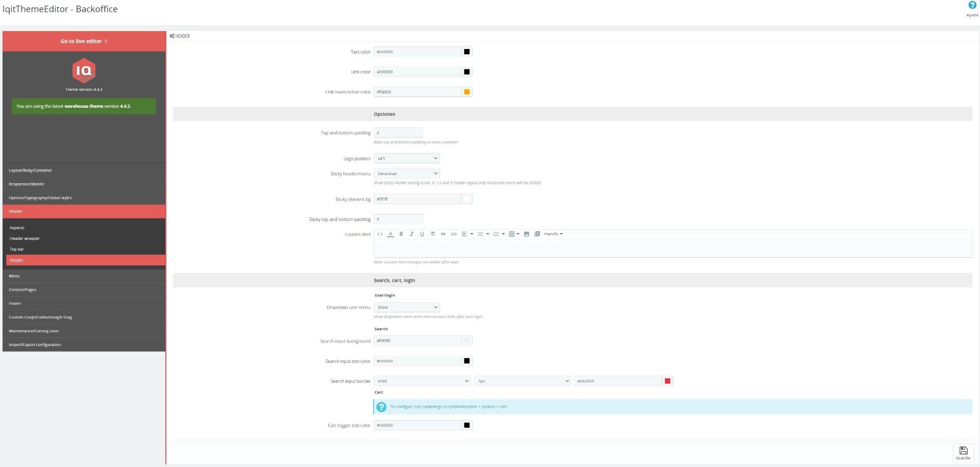 MartaMS Posted August 10, 2021 Author Share Posted August 10, 2021 14 hours ago, Josraso said: Desde el menu Iqit Theme Editor -> Header -> Header ; busca: Search, cart, login y donde pone Icon label pon show, ojo con los colores de las letras sin no te sale es posible que las tengas del mismo color que el fondo. No me aparece esta opción, lo que me aparece es lo que adjunto en la captura. ¿Hay alguna otra manera de hacerlo? Gracias Link to comment Share on other sites More sharing options...