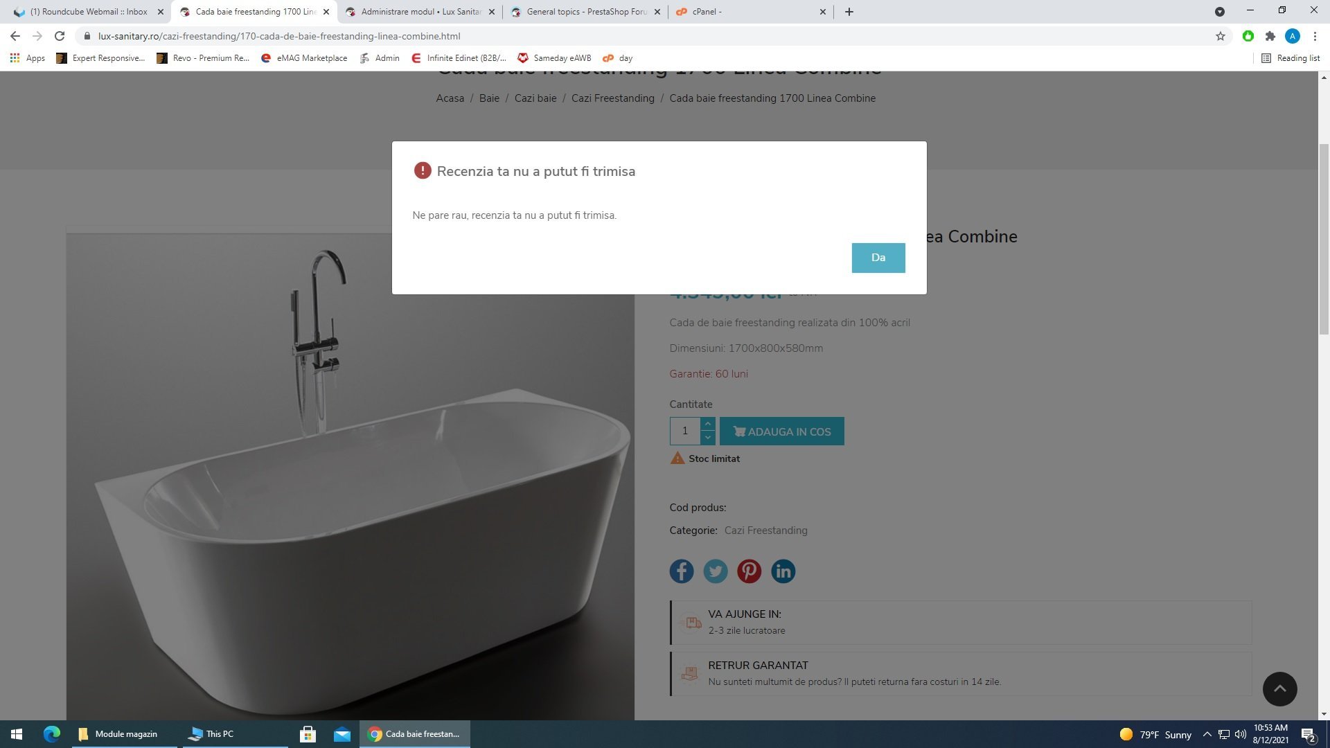 andreicos82 Posted August 12, 2021 Share Posted August 12, 2021 (edited) Hello. It seems that the latest version of the product reviews has a bug or maybe it's just me having problems. When you add a comment there is an error that the message could not be sent, but the message is sent and I can see it in the module. I don't understand what the problem is and why it gives an error if I can see the message in the module. Can someone help me? Thank you the website is lux-sanitary.ro Edited August 12, 2021 by andreicos82 (see edit history) Link to comment Share on other sites More sharing options...