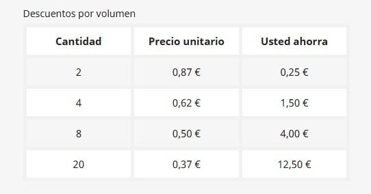 lunaroja Posted September 9, 2021 Author Share Posted September 9, 2021 Solución, al menos en la 1.7.7.3. Lo voy a probar en la 1.7.7.7. El fichero themes/classic/templates/catalog/_partials/product-discounts.tpl queda así, en negrita lo que se añade: <section class="product-discounts"> {if $product.quantity_discounts} <p class="h6 product-discounts-title">{l s='Volume discounts' d='Shop.Theme.Catalog'}</p> {block name='product_discount_table'} <table class="table-product-discounts"> <thead> <tr> <th>{l s='Quantity' d='Shop.Theme.Catalog'}</th> <th>{$configuration.quantity_discount.label}</th> <th>{l s='You Save' d='Shop.Theme.Catalog'}</th> <th>{l s='Price' d='Shop.Theme.Catalog'}</th> </tr> </thead> <tbody> {foreach from=$product.quantity_discounts item='quantity_discount' name='quantity_discounts'} <tr data-discount-type="{$quantity_discount.reduction_type}" data-discount="{$quantity_discount.real_value}" data-discount-quantity="{$quantity_discount.quantity}"> <td>{$quantity_discount.quantity}</td> <td>{$quantity_discount.discount}</td> <td>{$quantity_discount.save}</td> <td>{$quantity_discount.total_price}</td> </tr> {/foreach} </tbody> </table> {/block} {/if} </section> Y en el fichero classes\product\SpecificPriceFormatter.php se añade lo que está en negrita: $this->specificPrice['save'] = $priceFormatter->format((($initialPrice * $this->specificPrice['quantity']) - ($discountPrice * $this->specificPrice['quantity']))); $this->specificPrice['total_price'] = $priceFormatter->format($discountPrice * $this->specificPrice['quantity']); return $this->specificPrice; Resultado. Aunque es mejor con un % de descuento en lugar de una cantidad fija, por el tema del redondeo. Lo que me falta por hacer es igualar el ancho de las columnas, la 4ª queda muy estrecha , si sabéis donde se igualan... Link to comment Share on other sites More sharing options...