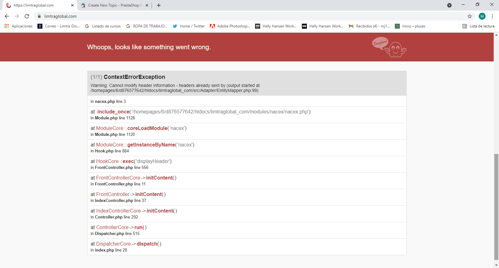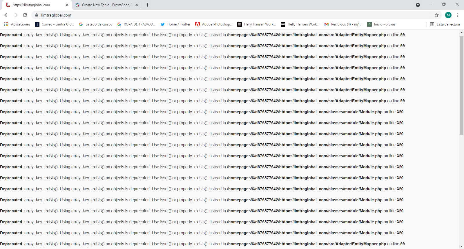 MJGG Posted August 27, 2021 Share Posted August 27, 2021 (edited) Buenos días a todos! Hasta el mes pasado, teníamos un soporte con la empresa que nos hizo la página. Ellos a su vez, el hosting lo tenían con Ionos. No estaba muy contenta y decidí prescindir de sus servicios por lo que me di de alta en Ionos y migré la página. Todo fue bien (salvo algunas cosas que se arreglaron). A primeros de ésta semana me doy cuenta que en diferentes páginas del backoffice, la información sale como descuadrada, fuera de las casillas, mal posicionadas... en fin, rara. Sin embargo, el frontoffice funcionaba bien. Busco a ver porqué puede pasar y encuentro que para saber los errores, se puede poner en modo depuración y de esa manera te dice cuales son para poderlos arreglar. Así hice y ahora, esto es lo que me aparece todo el tiempo, cada vez que quiero entrar tanto en el backoffice como en el frontoffice. No puedo hacer nada, ni siquiera quitar el modo depuración... no sé, alguien que me pudiera ayudar, por favor??? Muchas gracias!! Edited August 27, 2021 by MJGG He solucionado la parte del error: "Deprecated" y ya me funciona el frontoffice, pero sigo sin poder acceder al backoffice. (see edit history) Link to comment Share on other sites More sharing options...