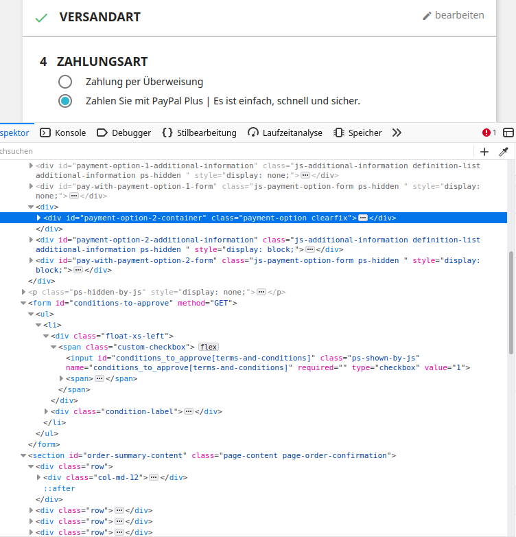 rictools Posted August 29, 2021 Share Posted August 29, 2021 Ich nehme an, daß du die id "payment-option-2-container" per "display: none;" ausblenden kannst, kann ich ohne die URL deines Shops zu kennen schlecht testen. Link to comment Share on other sites More sharing options...