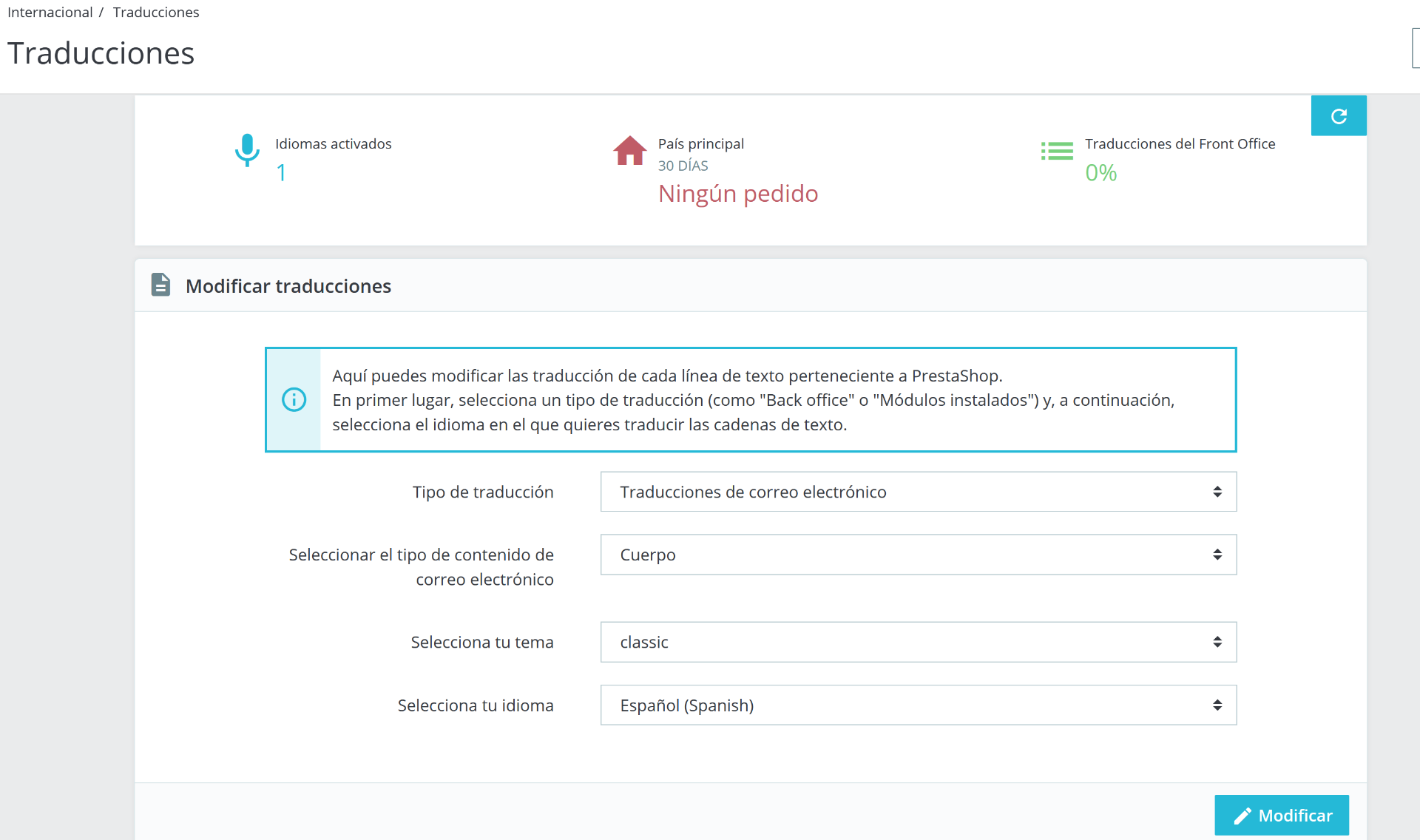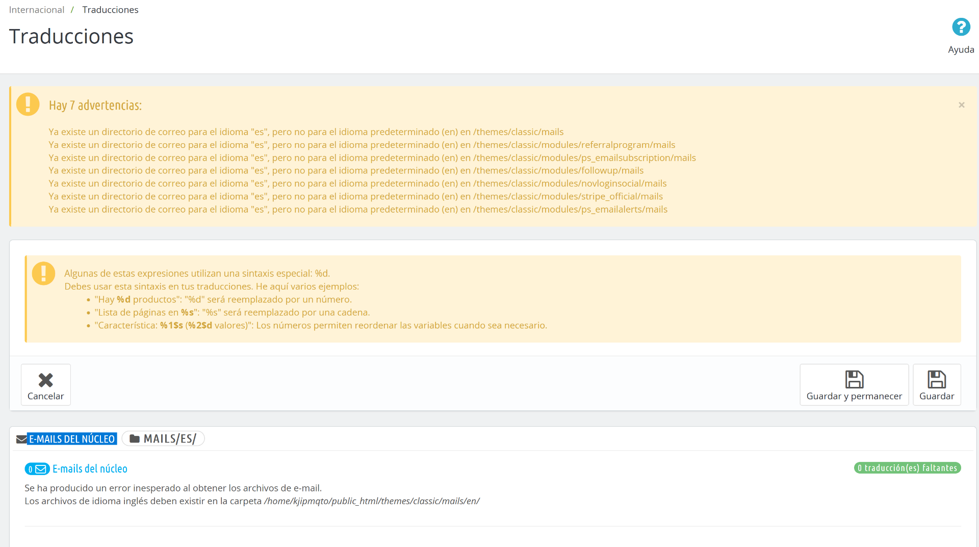 max8 Posted August 30, 2021 Share Posted August 30, 2021 Hola gente, Estoy intentanto traducir un email desde Internacional > Traducciones pero primero la traducción no se ha guardado y ahora me sale un aviso (mando captura). Comento detalladamente los pasos que he seguido para intentar traduccir algunas cadenas del email automático para el módulo cheque: - Internacional > Traducciones (Tipo de traducción:Traducciones de correo electrónico, Seleccionar tipo de contenido de Correo electrónico:Cuerpo, Selecciona tu tema:Classic*, Selecciona idioma: Español). *En selección de tema me aparecen 3 opciones: - Nucleo (ningún tema seleccionado) - Classic - vinova_nuranium_marketplace (mi tema activo) El primer intento lo hice seleccionado Classic y a continuación pude realizar las modificaciones en: E-mails del núcleo > cheque > Editar version HTML. Guarde y borre caché pero no se guardó la modificación realizada. En el segundo intento, al volver al acceder a: Internacional > Traducciones (Tipo de traducción:Traducciones de correo electrónico, Seleccionar tipo de contenido de Correo electrónico:Cuerpo, Selecciona tu tema:Classic*, Selecciona idioma: Español). Me parece este aviso y no deja hacer nada... He probado a seleccionar en tema: vinova_nuranium_marketplace pero me sale lo mismo. He probado también a cambiar el tema de los email en: Diseño > Tema Email > Cofiguración (primero tenia moderm y luego cambie a classic pero no veo cambios). ¿Alguna ayuda? Gracias por anticipado! Max Link to comment Share on other sites More sharing options...