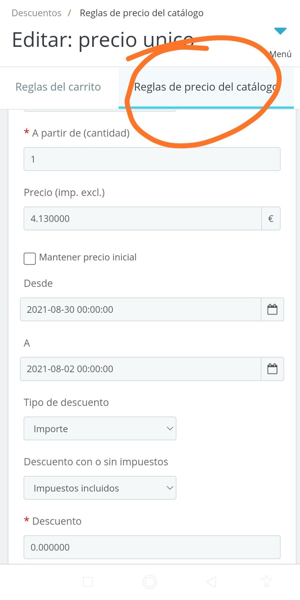cucada Posted September 1, 2021 Author Share Posted September 1, 2021 (edited) Hola Si si estoy en reglas del catálogo ...pero no veo cómo puedo mantener el precio anterior tachado e incluir un precio fijo a toda la categoría Te adjunto imagen de cómo lo tengo Asi cambian todos los precios a 5€, pero no se ve el precio anterior para ver la diferencia de precio Edited September 1, 2021 by cucada (see edit history) Link to comment Share on other sites More sharing options...