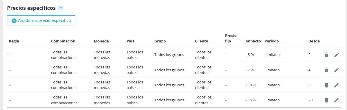 lunaroja Posted September 11, 2021 Author Share Posted September 11, 2021 (edited) Son precios específicos, de duración ilimitada. He probado de nuevo y pasa eso, se muestra la etiqueta/bandera si lo meto en el carrito. Además la etiqueta que aparece coincide con la cantidad que he metido en el carrito. Aunque tiene 4 precios específicos con descuentos muestra el que meta en el carrito, si compro 4 unidades la etiqueta muestra -7%. ¿Se pueden activar o desactivar esas etiquetas, donde? Edited September 11, 2021 by lunaroja (see edit history) Link to comment Share on other sites More sharing options...