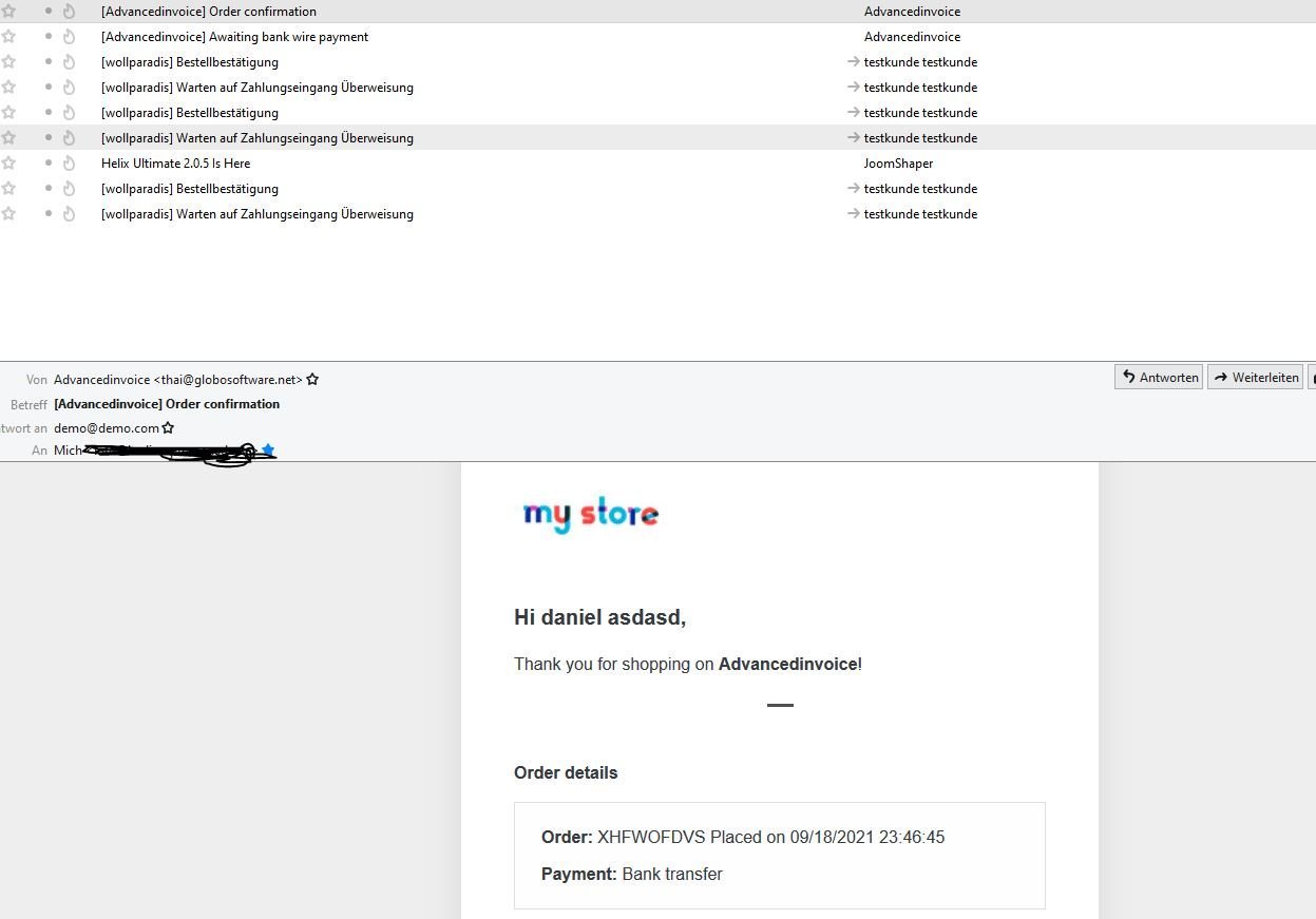 danielsaar Posted September 18, 2021 Author Share Posted September 18, 2021 (edited) Hi Musicmaster, its: 1.7.7.8 Could be its the wrong "Status" ("Shop Parameters -> Order Settings -> Statuses (second tab") I did the checkbox "on". I did it here: and here: To make a order test, I created a user inside a new User-Group. But inside this User-Group is nothing to block any PDF-sending. I can see something like "Autorisierte Module" but there is nothing about "PDF". As Mailclient I use Thunderbird. If there is a blocking of external content, normaly you can see a warning-text. Is there any kind of internal logg-history in Presta there i could find a row like "PDF-Attachment send by mail"?::: EDIT 1::: Now I tried this modul: https://addons.prestashop.com/demo/FO13778.html I hoped to get a PDF Invoice by testing the modul on the Demoshop But also I did not get any PDF: After this I send an PDF-Attachment to my Mailaccount. Its looks like this: In Thunderbird you see a Paper clip. ::::::::: END EDIT 1 ::::::::::: ::::: EDIT 2 :::::: What does this mean? When I klick on "Dokumente" there is a button "create invoice". I thought the invoice will be created automaticly and attached as a PDF to the confirmation Mail. Please help me. I can not understand the interrelationships. ::: END EDIT 2 ::::: yours, DAniel Edited September 20, 2021 by danielsaar (see edit history) Link to comment Share on other sites More sharing options...