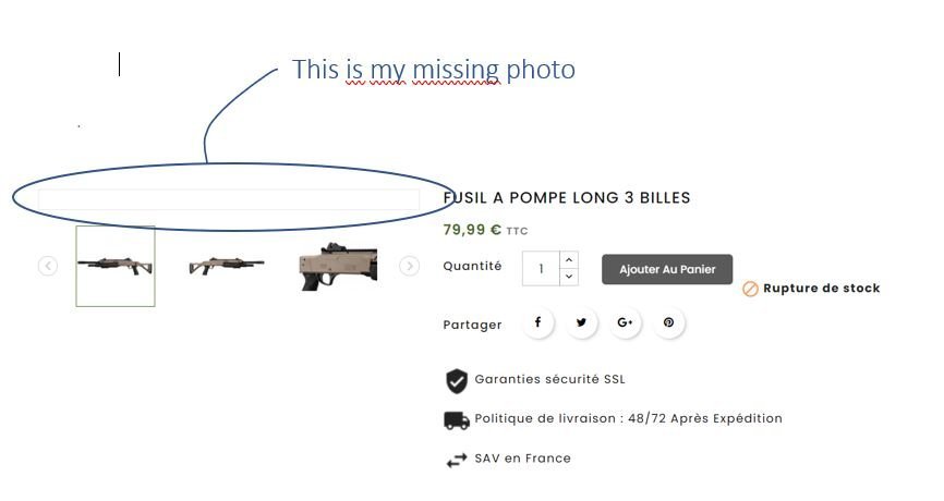 Essencial Airsoft Posted September 17, 2021 Share Posted September 17, 2021 Hello, I am new to e-commerce and looking to add keywords to my images in order to be referenced on Google "image" I realized that there was a display problem. The thumbnails are upload but not the main image of the product (the one that is displayed directly when we click on the product), if I press the magnifying glass to zoom it is upoad but when I click on the product I have only a white rectangle. I give you a screenshot that will explain my problem better than I do and a link to one of my articles (knowing that this problem persists on all my products). https://essencial-airsoft.fr/index.php?id_product=47&rewrite=pompe-2-&controller=product&id_lang=1 Thank you in advance to those who will take the time to help me solve this problem. Jeremiah Link to comment Share on other sites More sharing options...