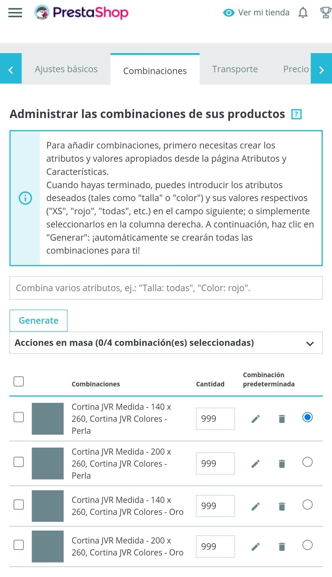 jla290 Posted September 18, 2021 Share Posted September 18, 2021 Hola, Estoy creando una página web y es el primer producto con combinaciones que creo. He visto varios tutoriales y en primer lugar he creado los atributos y los valores, posteriormente he creado un producto con combinaciones y he añadido los atributos que anteriormente he creado, generando así todas las combinaciones posibles. He añadido incrementos de precios, cantidad, etc... Sin embargo, una vez guardo todo lo anterior y actualizo el producto en cuestión en la página web, no salen los atributos pare seleccionar y realizar la combinación deseada. ¿A qué puede deberse esto? Un saludo. Link to comment Share on other sites More sharing options...