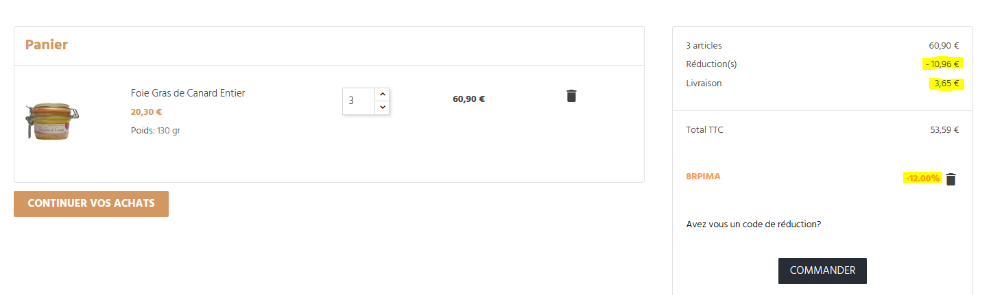 DevilYann Posted September 20, 2021 Share Posted September 20, 2021 Bonjour à tous Mon client vient de me faire remonter quelque chose de bizarre et pas très logique concernant les réductions. Il a crée un code donnant droit à -12% sur certaines catégories de son site ET livraison gratuite. Dans le principe cela fonctionne, mais l'affichage n'est pas très logique, voir dans la capture ci dessous. En effet plutôt que de marquer "livraison gratuite", la réduction sur la livraison est rajoutée sur la ligne Réduction(s), soit les 12% de 60.90€+3.65€ de livraison. Donc il a peur a juste titre que le client ne voit pas que la livraison est bien gratuite. J'ai fait un test avec un code promo ayant juste la livraison gratuite, pareil avec sur la ligne du code promo marqué "-0.00%". C'est normal d'après vous ? Link to comment Share on other sites More sharing options...