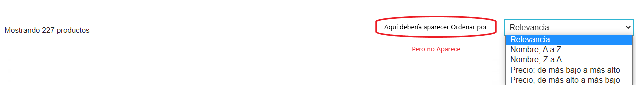 Hola, desde hace un tiempo, he notado que la leyenda "ordenar por no me aparece en la página de categorías, no tengo idea de lo que ha podido pasar, si se ve el desplegable con todas sus líneas, he buscado por todos lados y en todas partes y no he encontrado respuesta, se agradece ayuda, gracias de antemano