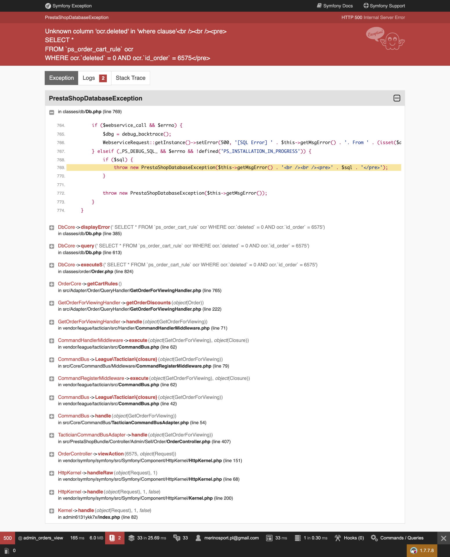 Donio3d Posted September 30, 2021 Share Posted September 30, 2021 Hey everyone. I'm working on shop and encountered problem, when accessing specific order, under Orders in backoffice. For first yes - I'm using custom theme, but they won't provide me support with this. Curious, but in clean local installation everything is working just fine, after importing same products DB. There is what I see without debug mode: Total cost is 45,00zł and none products are visible. Interesting is that, when I click show details and then show cart of guest - I can see products he (me via test) ordered. Now there's debug screen: As far as I know there's problem with orders DB. Cart should be all fine, because during checkout everything is perfect. Some things that may be important: I upgraded Prestashop from 1.7.7.6 to 1.7.7.8 via 1-click upgrade. I imported products from .sql file and overrided tables I did same in test installation, but there everything works fine. Shop is a fresh installation with custom theme. Yeah, so... Any ideas or at least good direction for searching? Thanks in advance! Link to comment Share on other sites More sharing options...
