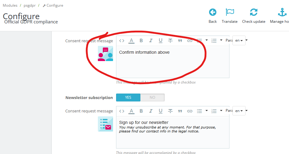 Marc_qc Posted November 5, 2021 Author Share Posted November 5, 2021 Hey hey, Thanks to ComGraPL https://www.prestashop.com/forums/profile/1489403-comgrafpl/ after and exchange of private message and some code change suggestion from him, we found that the checkbox is mandatory even if hidden as ComGrafPL mod showed me. So I follow his other recommendation and looked at the GDPR module where I finally found the source of the message. I updated it the same way I did with the classic theme and ... work around applied and result positive. Thank you so much for the help it's much appreciated Below is the location where the message update was made in GDPR confure module Again, big thanks for the help Link to comment Share on other sites More sharing options...