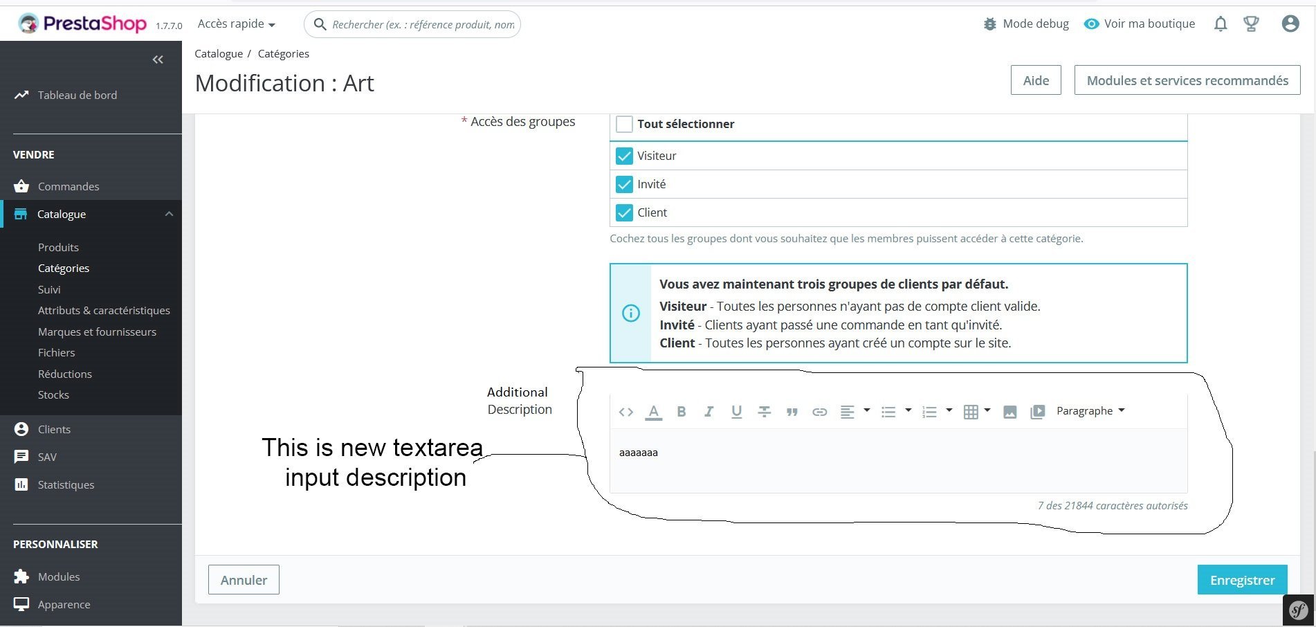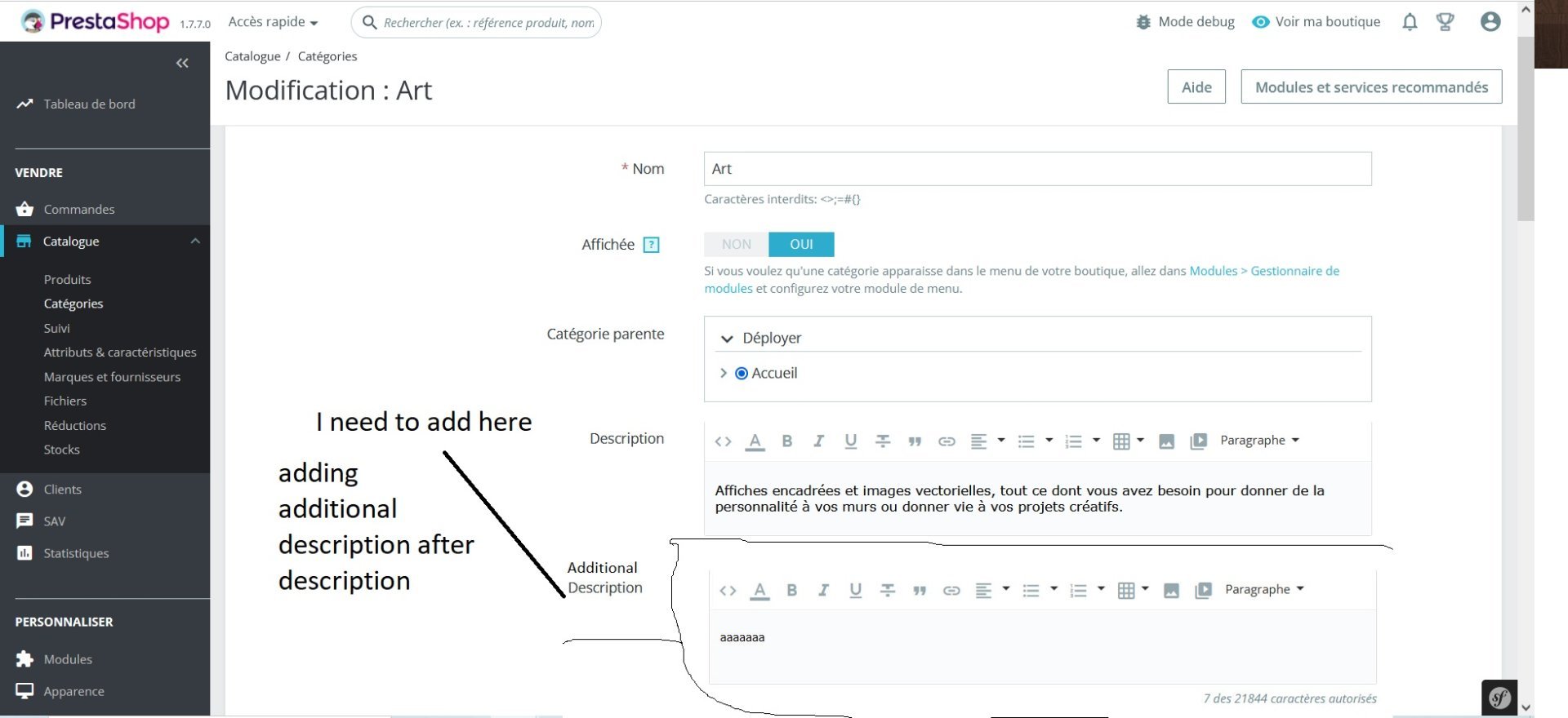 dupont max Posted October 6, 2021 Share Posted October 6, 2021 Hello everyone I hope you are well Please i have a question in prestashop 1.7.7.0 I have a custom module to add a new custom field textarea additional description in category page of back-office and everything works well (the attachment 1) now i need to change position of this input to put after the first description (the attachment 2) How can i do this ? Thank at advance best regards Link to comment Share on other sites More sharing options...