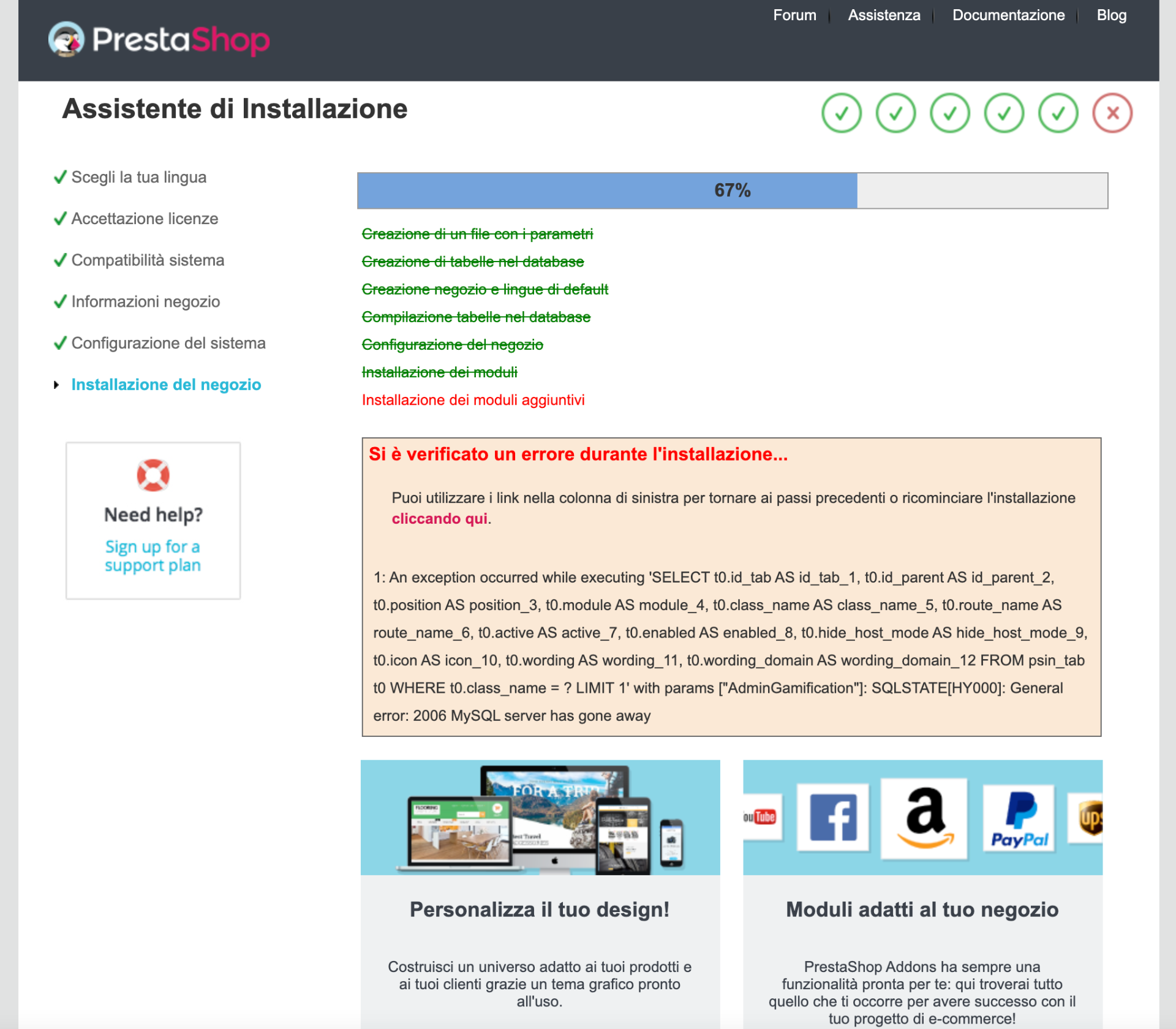 SimoneMessina Posted October 7, 2021 Share Posted October 7, 2021 al 67% in fase di installazione moduli aggiuntivi provato sia con prestahop 1.7.7.8 stable che con 1.7.8 stable ricevo il seguente errore Si è verificato un errore durante l'installazione... Puoi utilizzare i link nella colonna di sinistra per tornare ai passi precedenti o ricominciare l'installazione cliccando qui. 1: An exception occurred while executing 'SELECT t0.id_tab AS id_tab_1, t0.id_parent AS id_parent_2, t0.position AS position_3, t0.module AS module_4, t0.class_name AS class_name_5, t0.route_name AS route_name_6, t0.active AS active_7, t0.enabled AS enabled_8, t0.hide_host_mode AS hide_host_mode_9, t0.icon AS icon_10, t0.wording AS wording_11, t0.wording_domain AS wording_domain_12 FROM psin_tab t0 WHERE t0.class_name = ? LIMIT 1' with params ["AdminGamification"]: SQLSTATE[HY000]: General error: 2006 MySQL server has gone away. Qualche suggerimento su come risolvere? Ho già provato a modificare vari parametri del server in configurazione PHP Link to comment Share on other sites More sharing options...