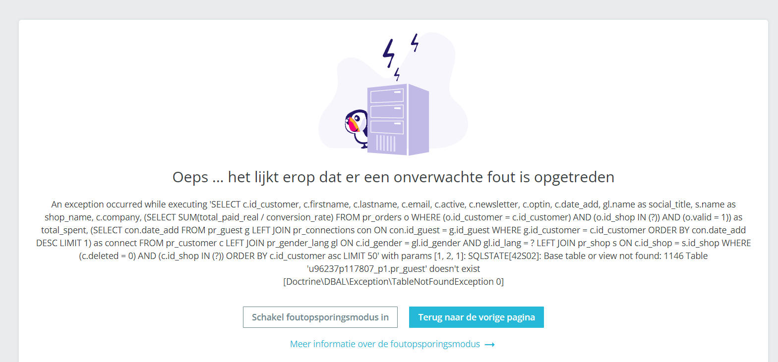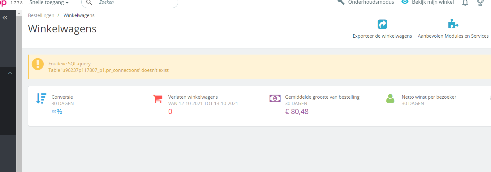 Rico92 Posted October 13, 2021 Share Posted October 13, 2021 (edited) Beste allen, Ik heb vanavond geprobeerd te updaten naar 1.7.8. maar zag dat het lettertype/opmaak ineens veel groter was geworden in een lettertype wat ik niet wil en er dingen misten op de homepage. Tevens kon ik niet meer via de backoffice naar mijn klantenpagina en werkt mijn actieve winkelwagen niet meer. Hierop heb ik een rollback uitgevoerd. Helaas bleven de twee errors bestaan. Als ik in de backoffice naar mijn pagina ''Klanten'' wil, dan krijg ik volgende error: En wanneer ik de ''Actieve Winkelwagens'' wil benaderen vanuit het dashboard in backoffice, krijg ik de volgende melding: Is er iemand die mij naar de oplossing kan helpen voor twee bovenstaande problemen? Ik werk nu een kleine 7 maanden probleemloos met Prestashop, op wat kleine dingetjes na die ik zelf heb op kunnen lossen. Deze twee errors heb ik in ieder geval niet kunnen vinden door even te googelen. Ik hoor het graag als iemand mij kan helpen. Alvast hartelijk dank! Met vriendelijke groet, Ricardo Edited October 14, 2021 by Rico92 forgot something to mention (see edit history) Link to comment Share on other sites More sharing options...