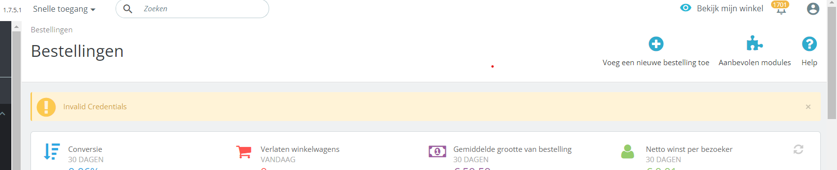 Gerard 1 Posted October 24, 2021 Share Posted October 24, 2021 Als ik in de backoffice bij bestellingen kijk, dan staat boven aan de pagina in een gele balk invalid credentials. Weet iemand hoe ik dat kan oplossen. Ik werk met prestashop 1.7.5.1 Link to comment Share on other sites More sharing options...