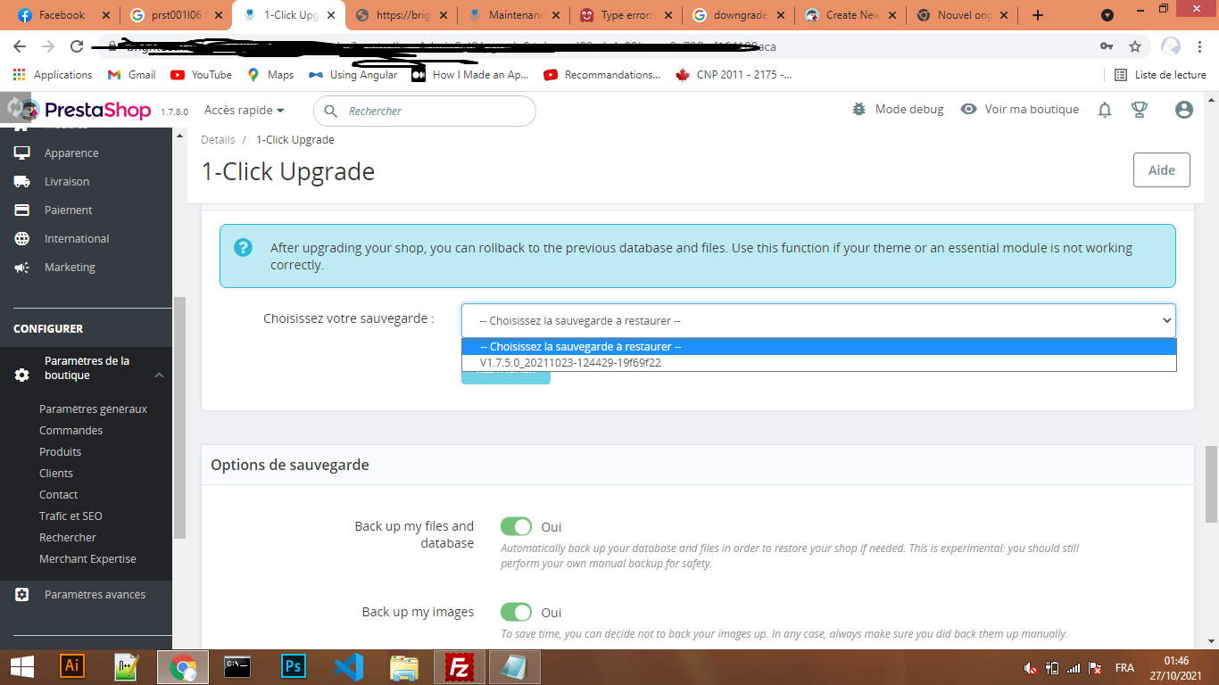 innocenceesstt Posted October 27, 2021 Share Posted October 27, 2021 bonjour tout le monde après la mise à jour de prestashop (de 1.7.5.0 à 1.7.80) j'ai eu un problème avec le module (IshiBlockWishList) de ishithemes. Même en désactivant le module j'ai une exception avec le module wishlist et le site ne fonctionne pas toujours.. j'ai une sauvegarde comme affiché dans l'imprime écran, mais avant la faire j'ai voulu savoir si la restauration de la version antérieure va affecter les données sauvegardées après la date de sauvegarde (l'historique des achats, les données des clients) merci d'avance Link to comment Share on other sites More sharing options...