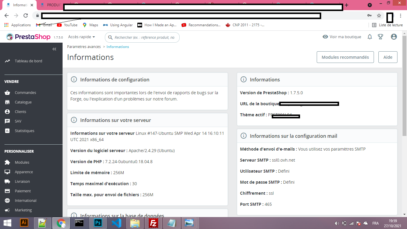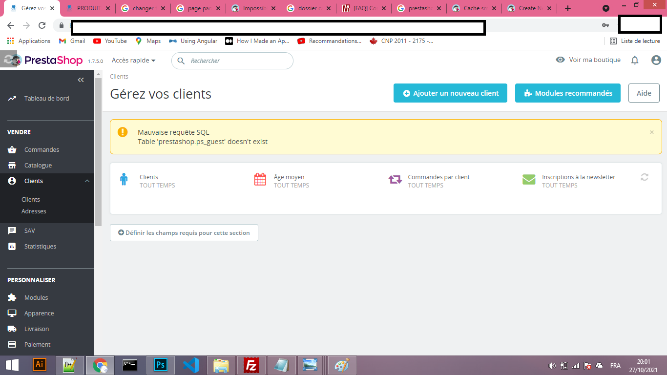 innocenceesstt Posted October 27, 2021 Share Posted October 27, 2021 Bonjour tout le monde, la mise à jour de prestashop (de 1.7.5 à 1.7.8) a causé des problèmes (exceptions) vu son incompatibilité avec le thème choisi. Pour ce fait j'ai restauré une version sauvegardée.. mais je suis surprise par le fait que les clients ont disparu vu la disparition de la table comme c'est clair dans l'imprime écran. Encore en voulant modifier la section copyright(en modifiant footer.tpl) j'ai pas pu recompiler le template ( la page paramètres avancées ne s'affiche plus comme c'est montré dans le deuxième imprime écran..même en supprimant le cache manuellement (dossier dev et prod) les changements ne sont pas encore visibles merci pour votre aide Link to comment Share on other sites More sharing options...