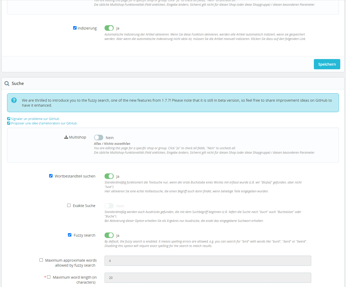 youbenick Posted November 8, 2021 Author Share Posted November 8, 2021 Diese verwirrende Darstellung ist seit dem Update auf 1.7.8.0 so. Ich persönlich finde das auch eher verwirrend. Die Option Multishop oberhalb ist ja nur dazu da, um alle Felder gleichzeitig editierbar zu machen, sobald ich speichere sind die Felder wieder ausgegraut. Die Option "Wortbestandteil suchen" ist auch unter "alle Shops" aktiviert. Der Satz "Die übliche Multishop-Funktionalität (Feld anklicken, Eingabe ändern, Sichern) gilt nicht für diesen Shop (oder diese Shopgruppe) / diesen besonderen Parameter." ist auch irgendwie kryptisch. Ich habe jetzt die Indizierung und die Suchoptionen unter "Alle Shops" deaktiviert und jetzt speziell für jeden Shop aktiviert. Danach habe ich einen Suchindex rebuild gemacht sowie Cache gelöscht. Leider mit dem gleichen Ergebnis. Suche ich nach "Aufbewahru" werden 97 Artikel gefunden, suche ich nach "ufbewahru" werden 0 Artikel gefunden.. Ich habe echt kein Ahnung woran das noch liegen könnte. LG, Tom Link to comment Share on other sites More sharing options...