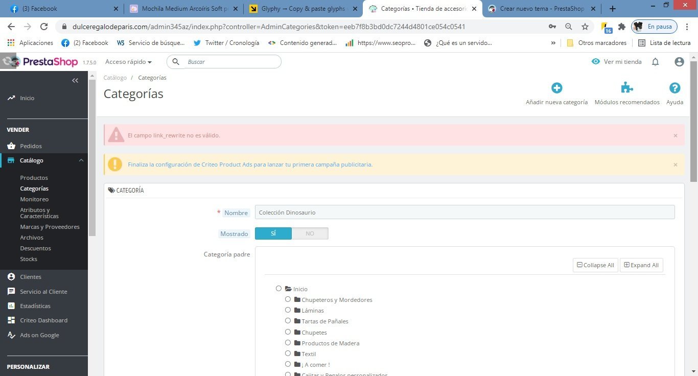 Susy5 Posted November 14, 2021 Share Posted November 14, 2021 (edited) No me deja incrementar mas categorias !!!!!!!! Socorro tengo que poner mas colecciones !! AYUDA Lo he intentado todo y nada de nada, solo tengo esas 7 colecciones y tengo que poner mas, he borrado cache, he cambiado de todo y de todas formas y he mirado las ayudas y NADA Edited November 14, 2021 by Susy5 El campo link_rewrite es requerido al menos en Español (Spanish). aun cambiando de Navegador NADA DE NADA (see edit history) Link to comment Share on other sites More sharing options...